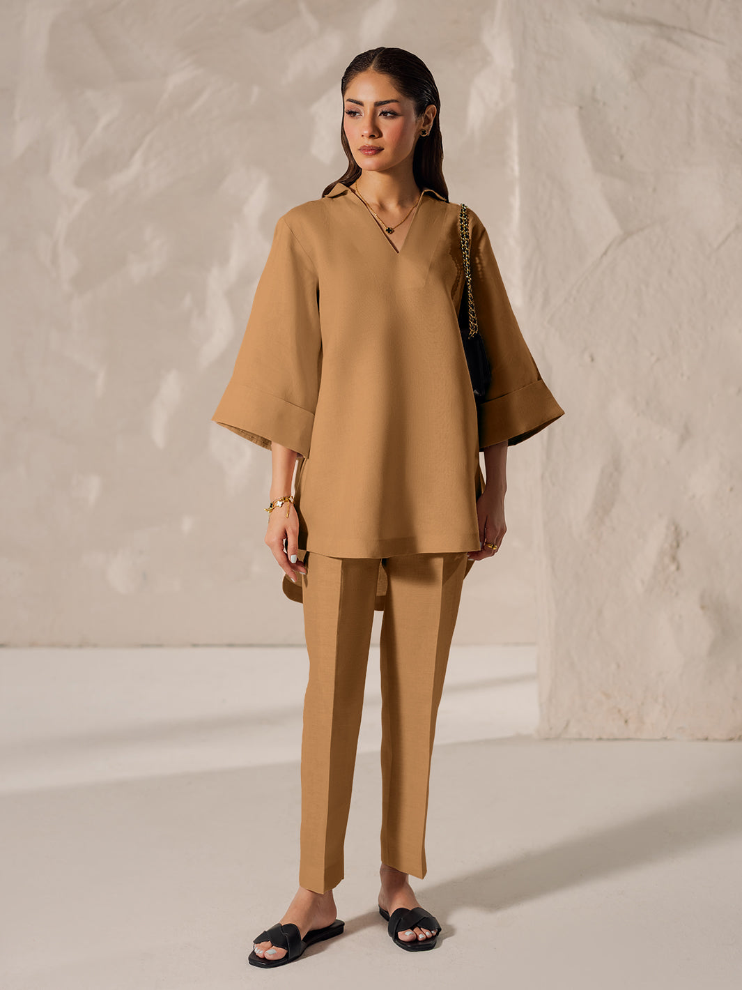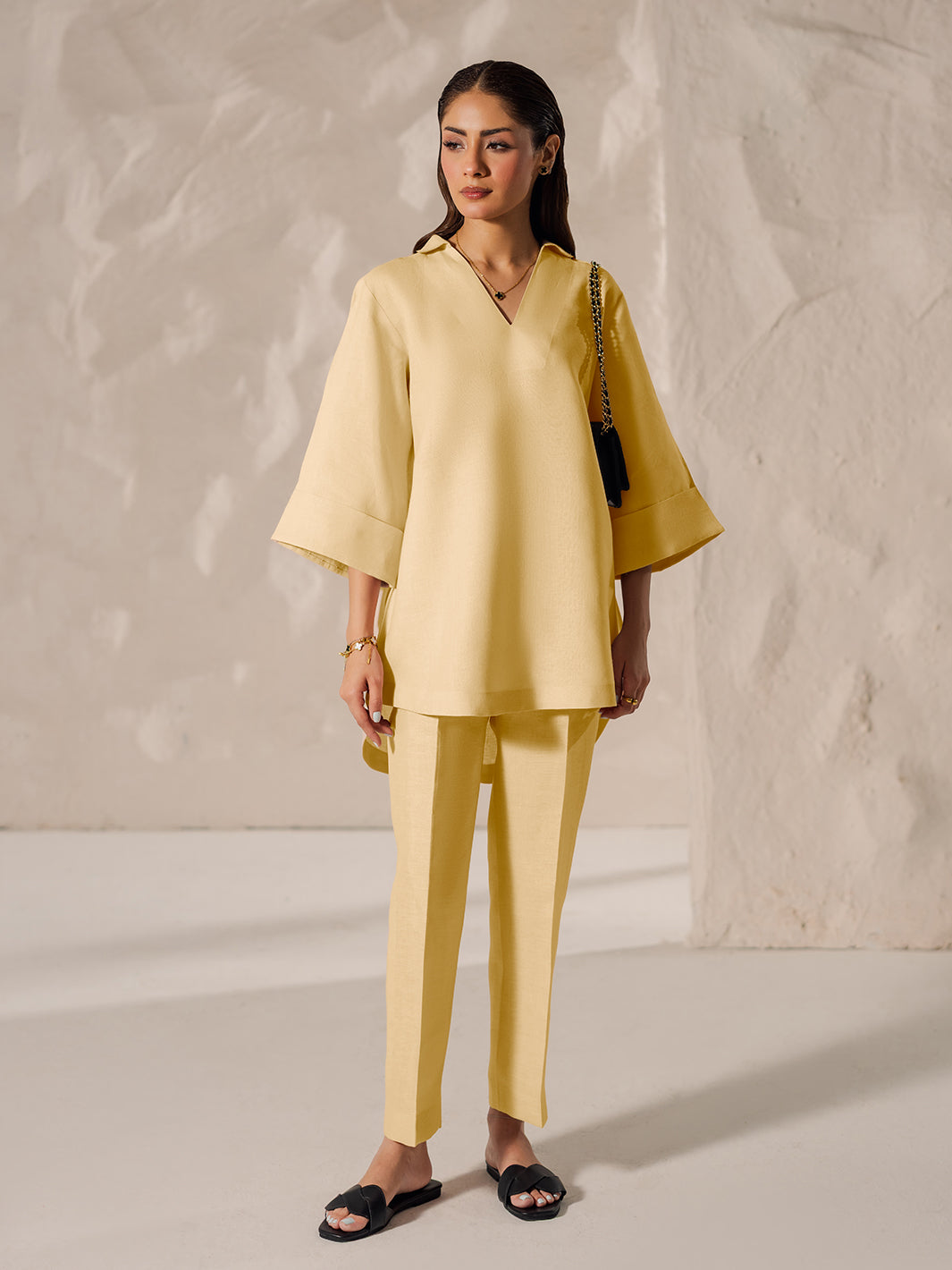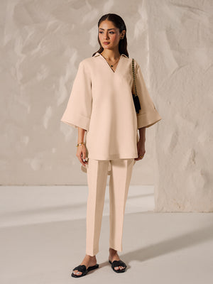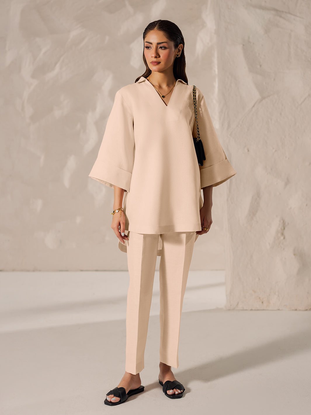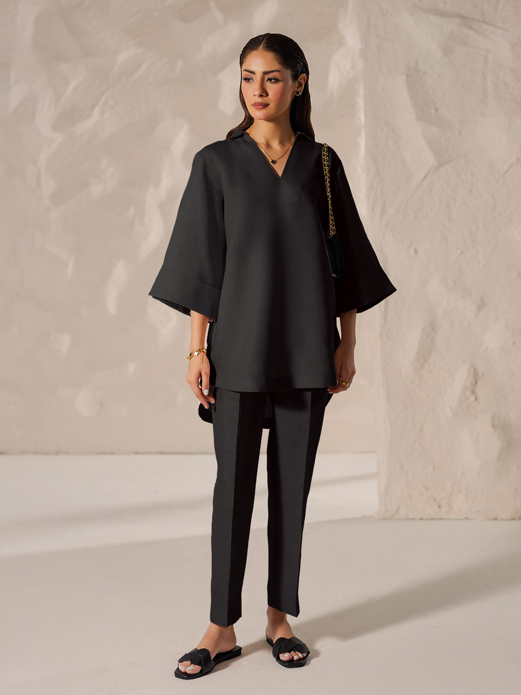 Design Details: V-neck tunic with flared sleeves, clean straight-leg trousers