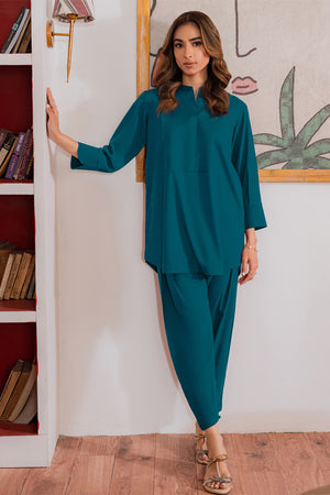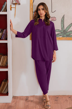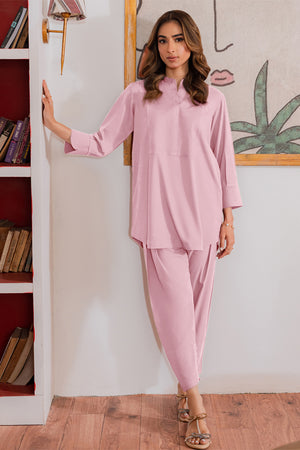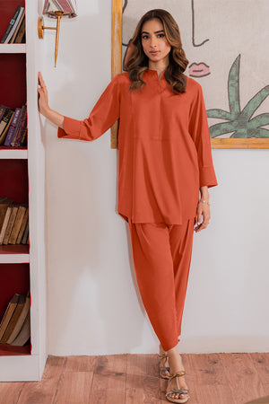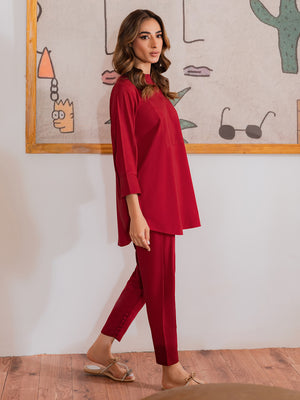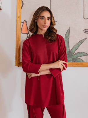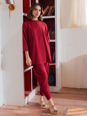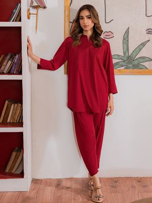 This 2-piece women's outfit brings together effortless charm and comfort, designed in a soft, flowing fabric georgette fabric. The cherry red maroon Top features a relaxed fit, enhancing its comfortable and chic appeal. It comes paired with elegant slim shalwar with button detailing at the ankle, adding a modern twist to traditional styling. Ideal for daily or basic wear, this outfit offers lightweight comfort with a graceful finish.