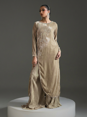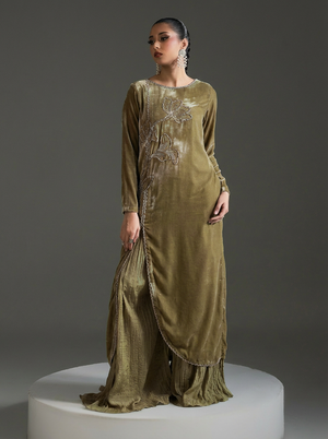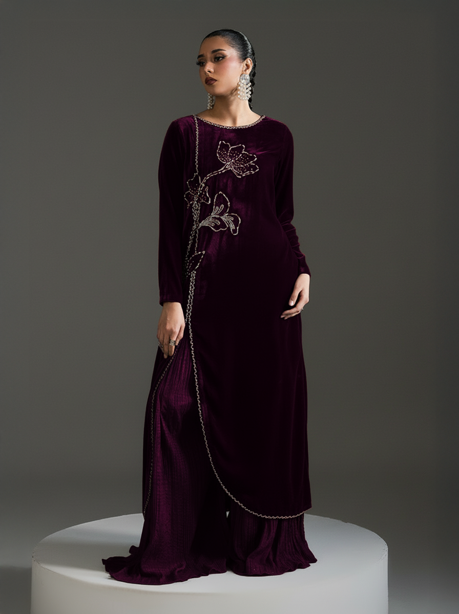 | Design Details | Boat neckline, long velvet top with a unique, diagonally trailing silver floral Embellished motif, paired with crushed/pleated wide-leg trousers. |