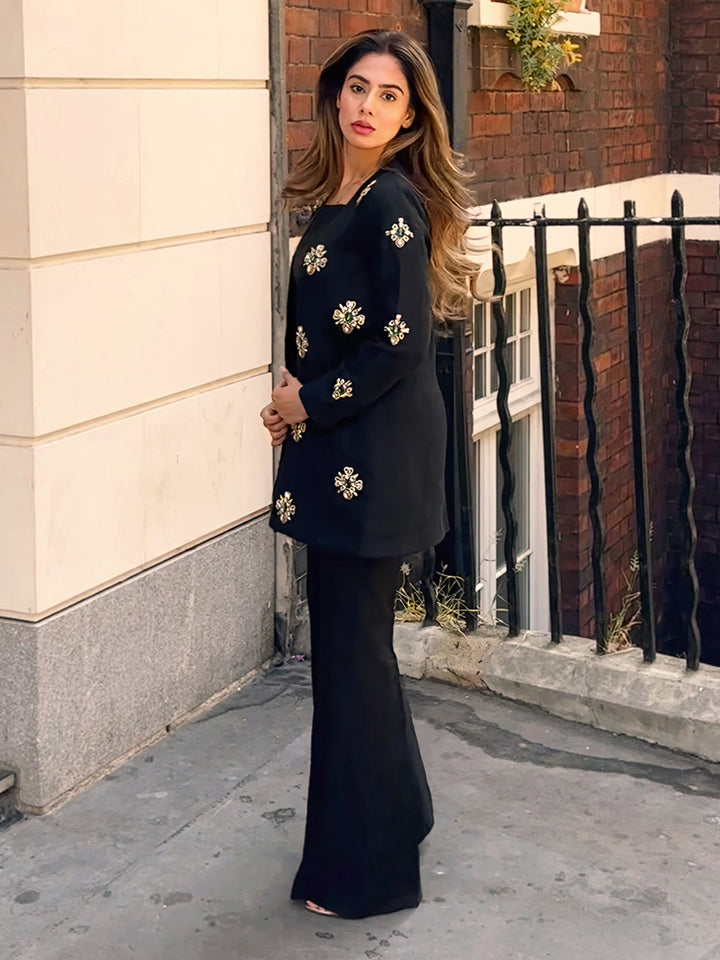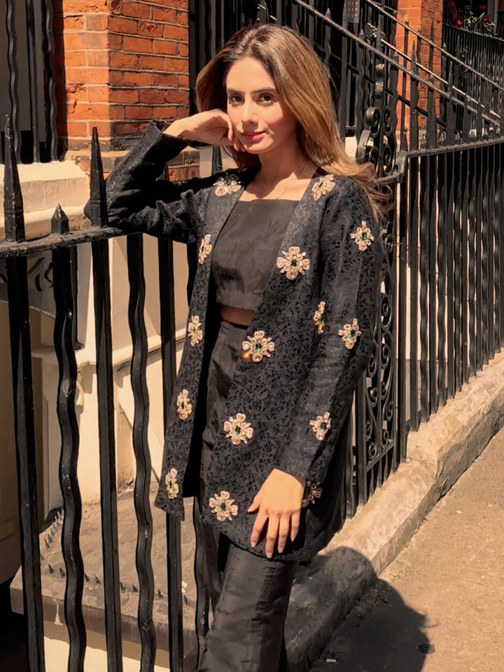 Turn heads with our Noir Set, a chic and contemporary ensemble designed for the modern muse. This black thres-piece set features a tailored longline jacket adorned with intricate floral embellishments crafted from pearls, stones, and metallic accents. The boot-cut pants and matching black crop top offer a sleek silhouette that’s both timeless and trend-forward.