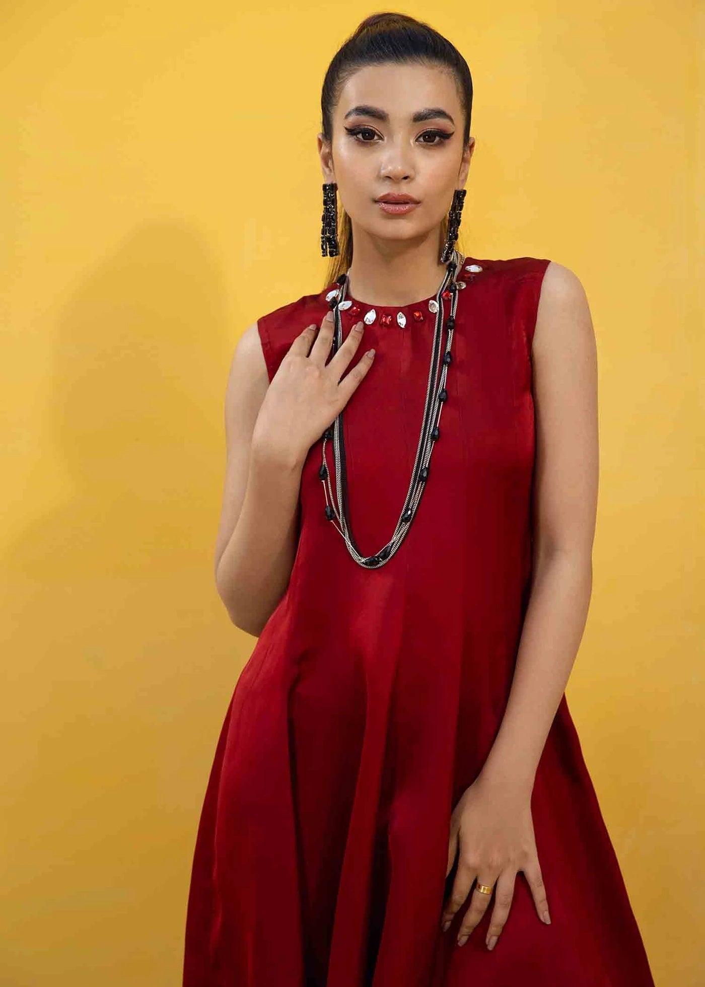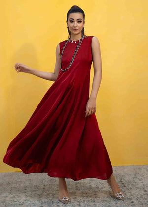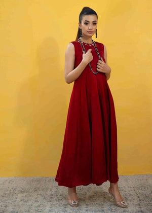 Red Ahead is a perfect paneled dress made in Poly Shamooz Silk fabric. The long length, flared style and simple neckline embellished with stones makes it a formal dress for any evening wear.