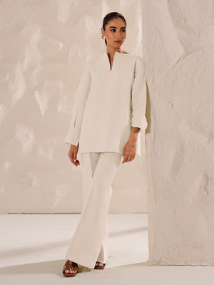 Design Details: Scalloped neckline & sleeves, straight-leg trousers