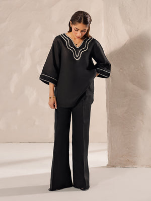 The deep black hue, paired with minimal white embroidery, creates a bold contrast that feels polished yet understated. The relaxed silhouette drapes gracefully, allowing for movement, ease, and all-day comfort, whether you’re on the go or off-duty.