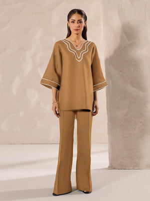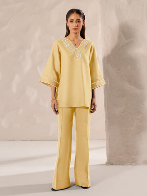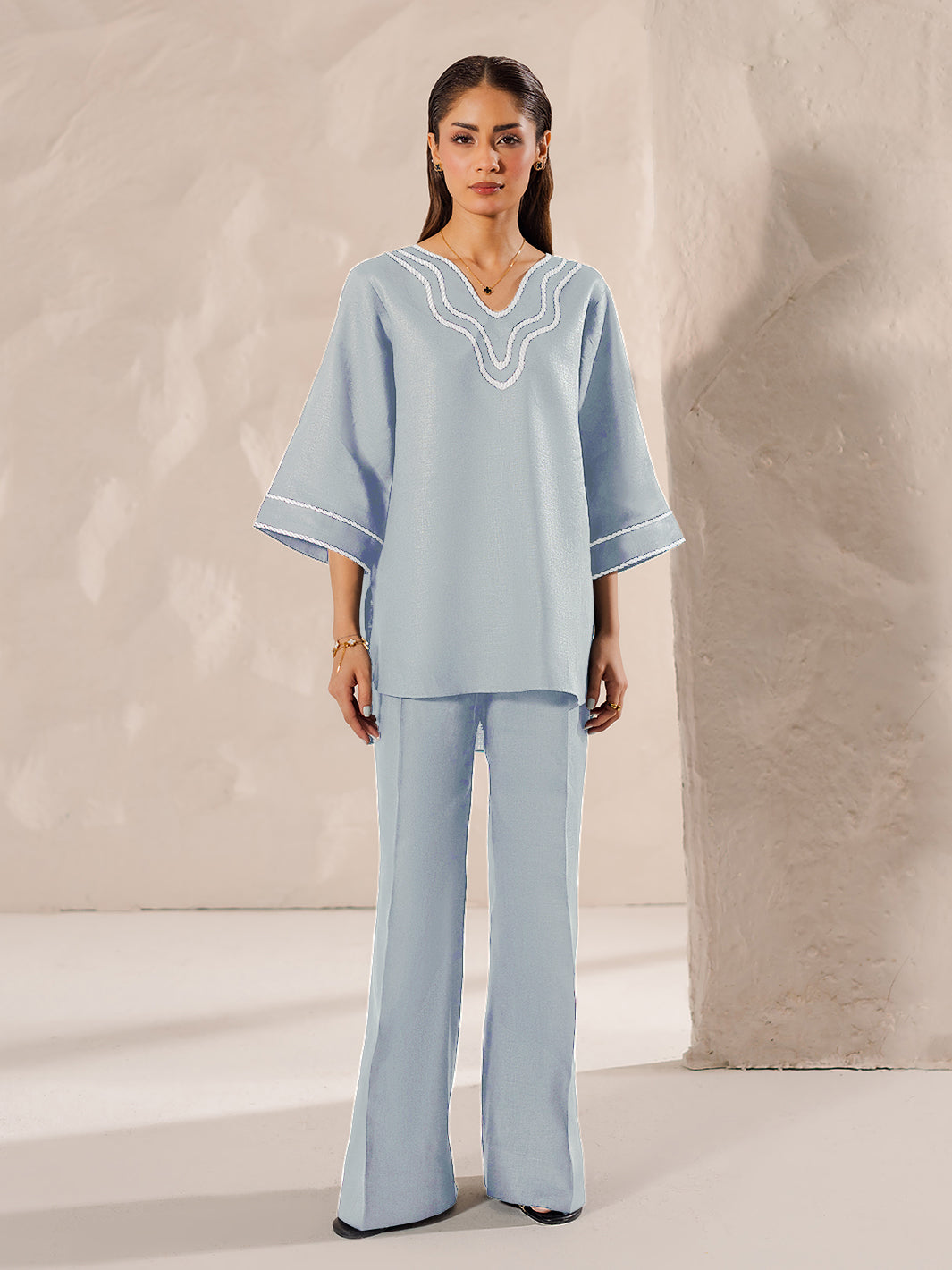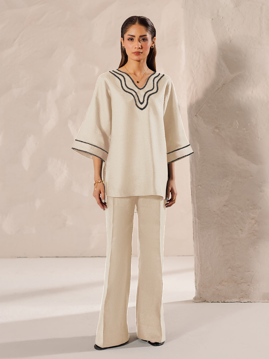 Design Features: Relaxed silhouette, embroidered neckline & sleeves, wide-leg trousers