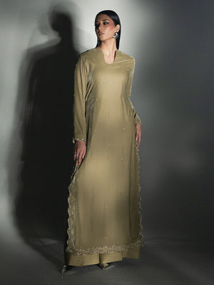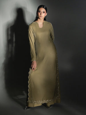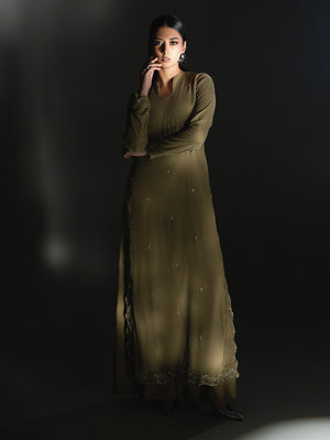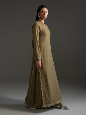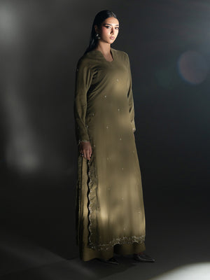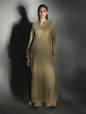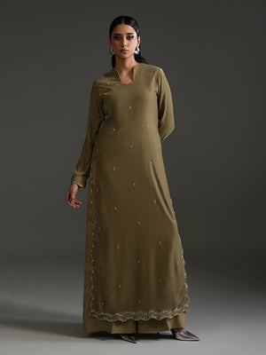 Embrace refined simplicity with the Moss Atelier Suit, a chic ensemble crafted from flowing, elegant moss-green fabric (likely a crepe or silk blend). This two-piece set features a long, straight-cut kurta with a classic slit neckline. The top is subtly enhanced with delicate scattered beadwork and a richly embroidered border of silver/gold tilla and beads along the hemline and side slits. Paired with coordinating wide-leg trousers, Moss Atelier offers a contemporary, graceful silhouette, perfect for sophisticated daytime events or semi-formal gatherings.