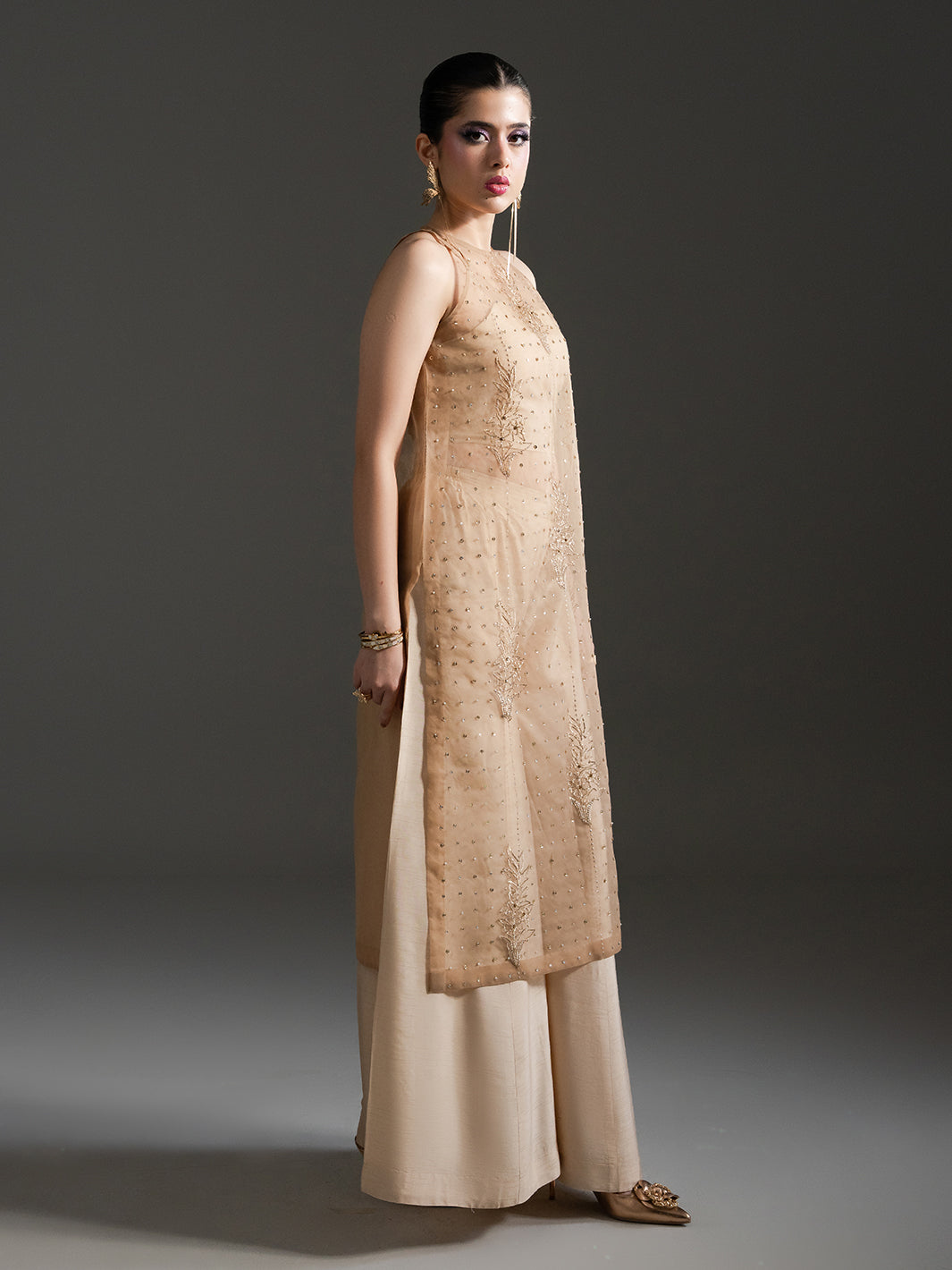 | Design Details | Intricate Adda hand-work on shirt and dupatta, sleeveless halter-style neckline, paired with wide-leg rawsilk trousers. |