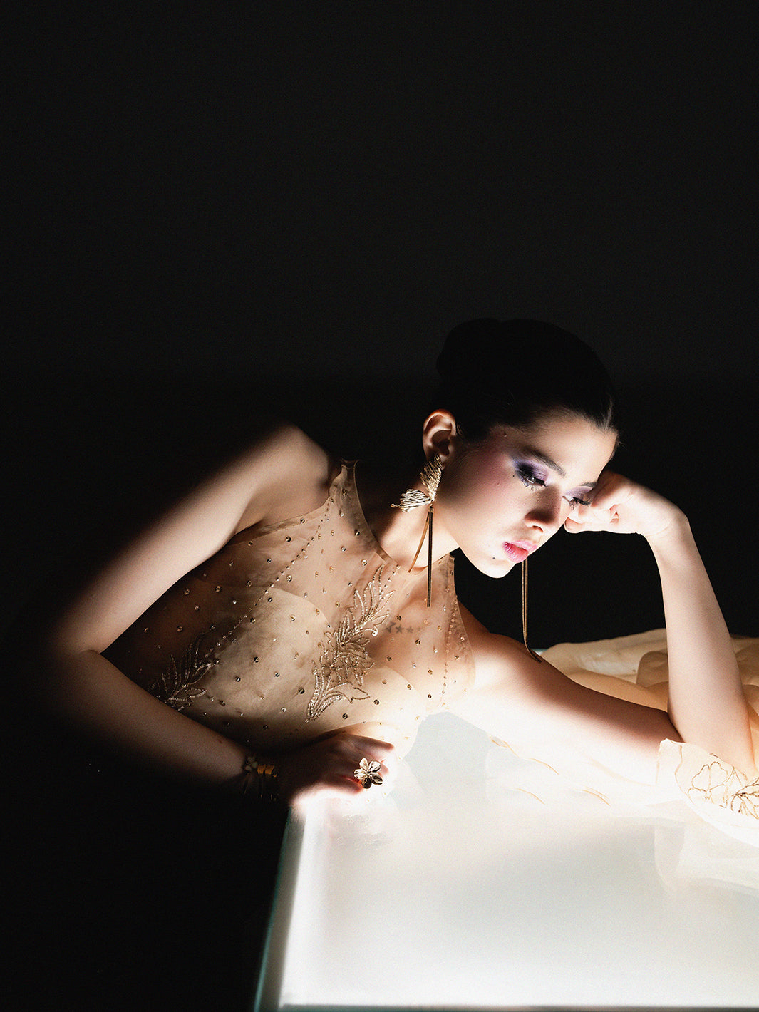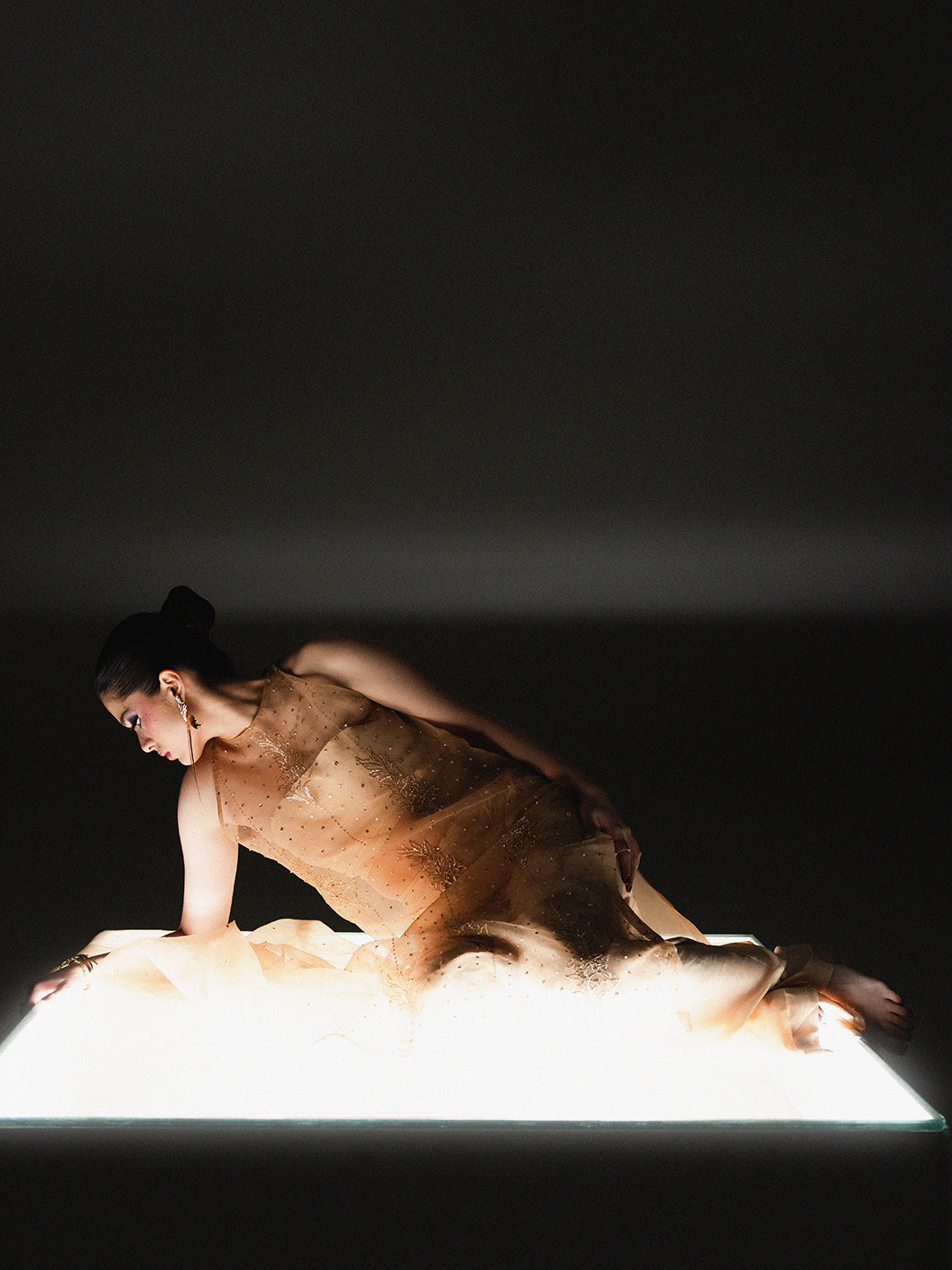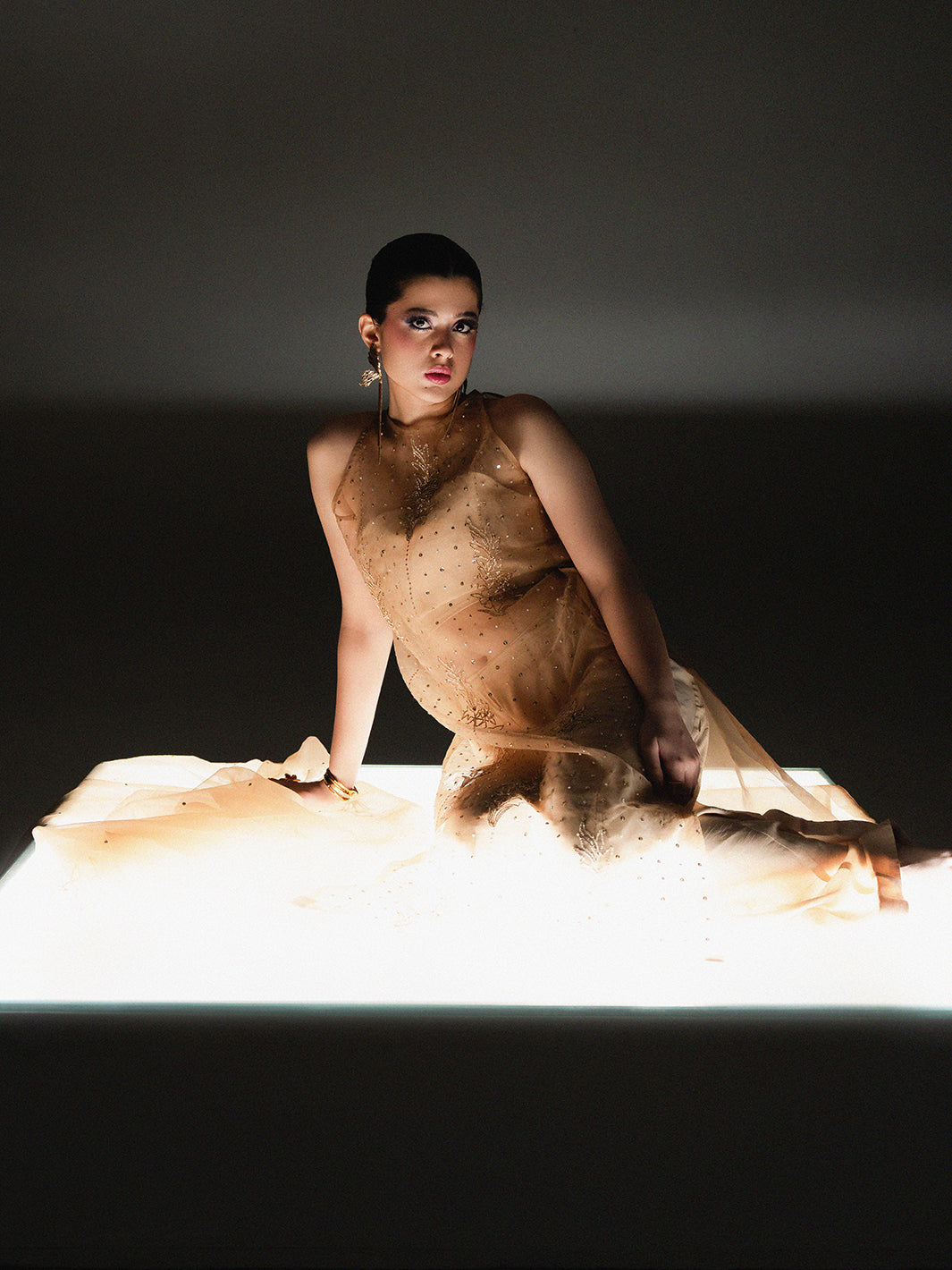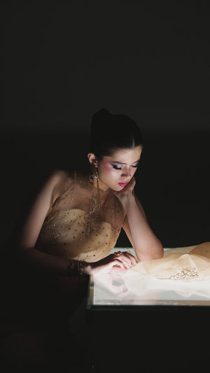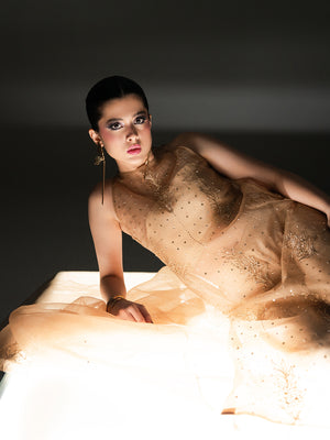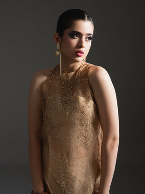 Radiate ethereal beauty in Mehrab, a golden-hued masterpiece from the Petaline collection. This sophisticated ensemble features a sheer Organza shirt meticulously detailed with intricate Adda work, showcasing artisanal hand-embroidery that glimmers with every movement. The shirt is perfectly paired with structured Rawsilk trousers, creating a refined play on textures. To complete the regal look, a coordinating Organza dupatta with matching hand-worked accents is included, offering a gossamer-light drape. Mehrab is the epitome of luxury festive wear, designed for the Kiara woman who seeks a luminous and unforgettable silhouette for her most special occasions.