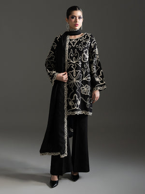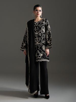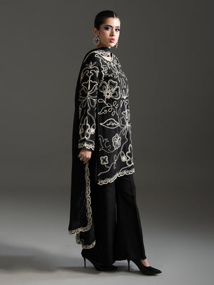 | Design Details | Elaborate all-over ivory hand-embroidery, scalloped hemline and cuffs, paired with wide-leg trousers and a black dori embellished dupatta. |