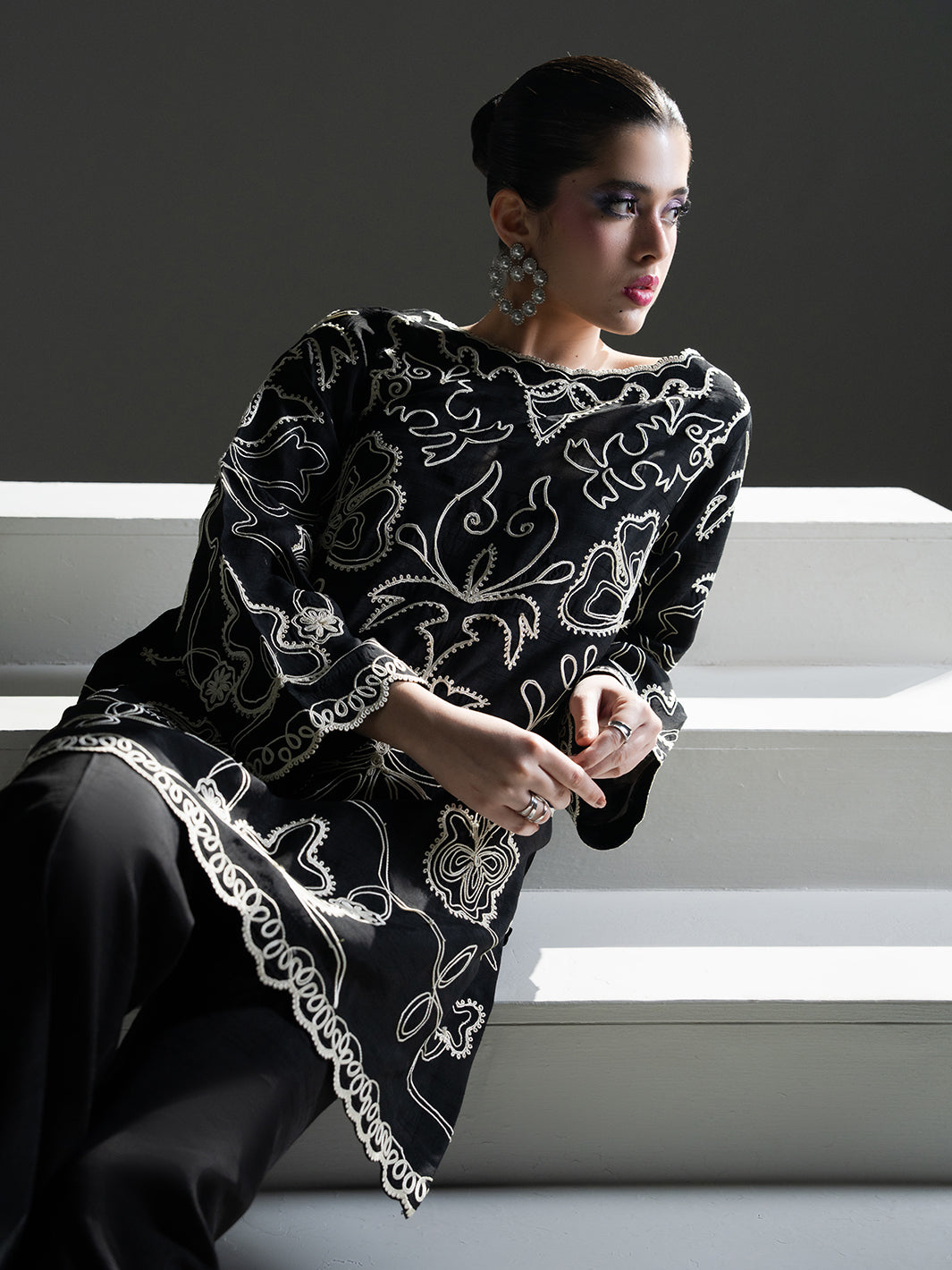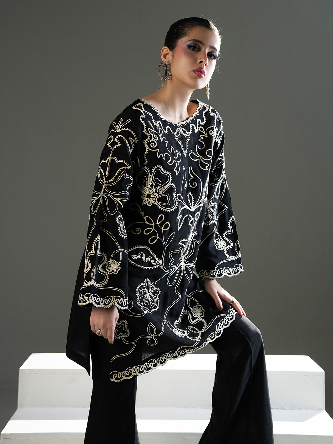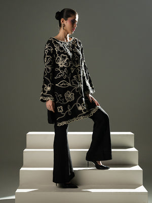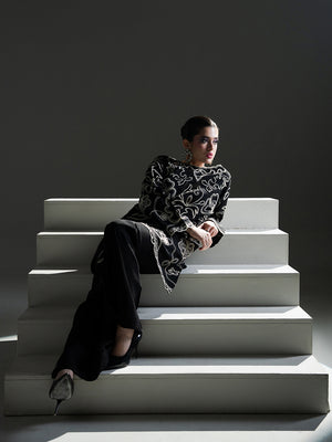 Command the night in Moonfell, a striking masterpiece of noir elegance from the Petaline collection. Meticulously crafted from premium Raw Silk, this ensemble offers a structured, regal silhouette in an eternal jet-black hue. The shirt is a canvas of high-contrast artistry, featuring extensive hand-embroidery (EMB) in ivory tones that sprawl across the entire bodice and sleeves in a bold, botanical-inspired pattern. the outfit is paired with fluid, wide-leg trousers and a coordinating black dori detailed dupatta. Moonfell is designed for the woman who seeks a dramatic yet sophisticated statement, blending traditional craftsmanship with a modern, high-fashion edge.
