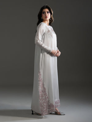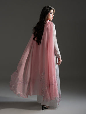 | Design Details | Long straight silhouette featuring intricate pink floral hand-embellishments on the hem, neck, and cuffs, finished with a Pure Viscose Organza dupatta. |