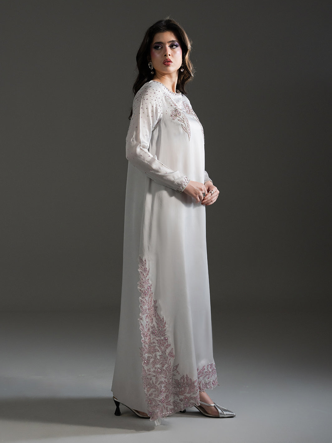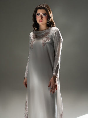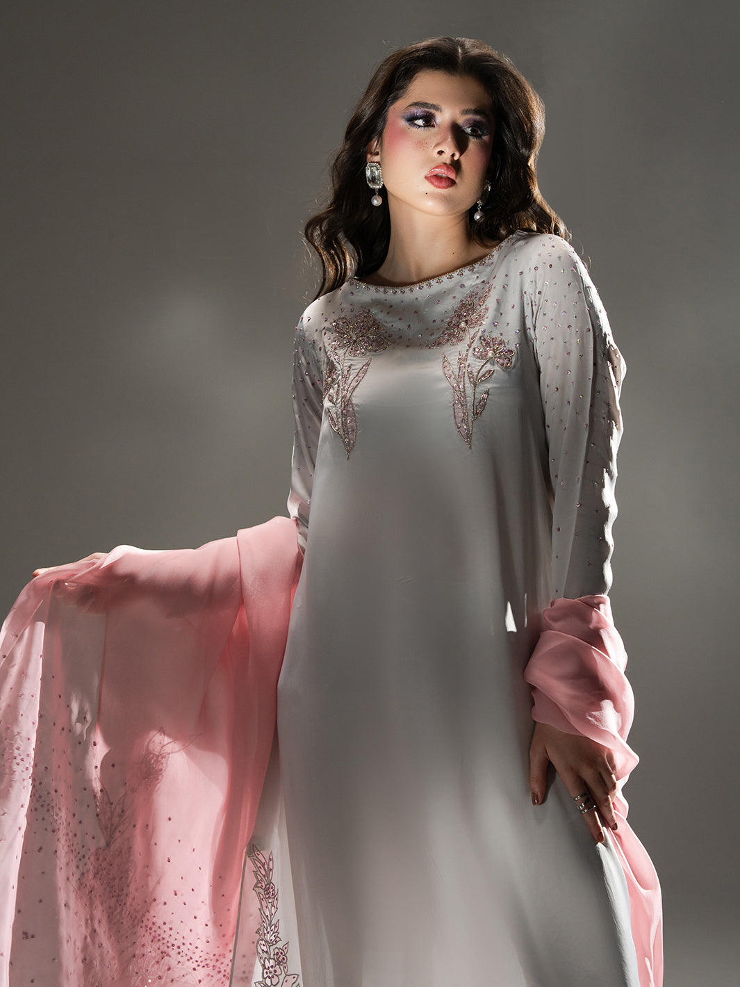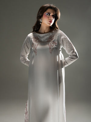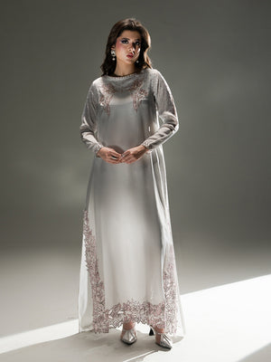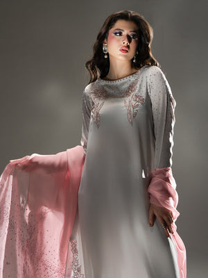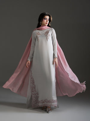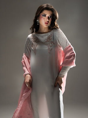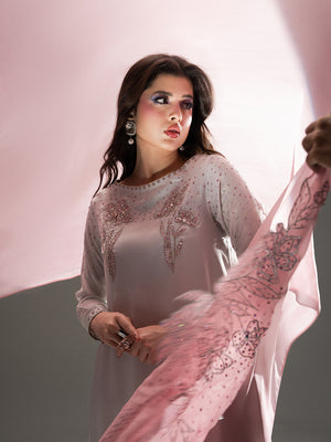 Evoke the serene beauty of a dawn garden with Petal Mist, a centerpiece of the Petaline collection. Crafted from luminous Organza Satin in a sophisticated misty lavender-grey hue, this ensemble radiates an ethereal charm. The long-line shirt is exquisitely detailed with sprawling, hand-embellished floral patterns in soft pink tones that bloom along the hemline and elegantly frame the neckline and cuffs. A delicate spray of shimmering accents across the sleeves and bodice adds a subtle, celestial glow. Paired with fluid trousers and a Pure Viscose Organza dupatta, Petal Mist offers a graceful, flowing silhouette that is both timeless and modern.