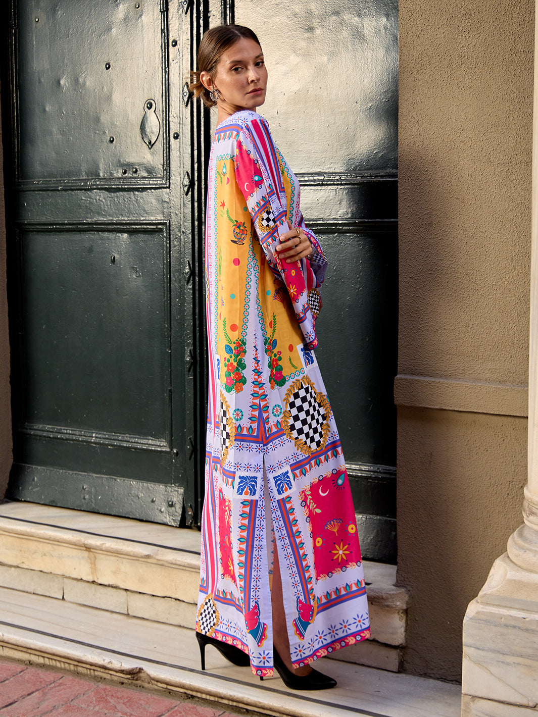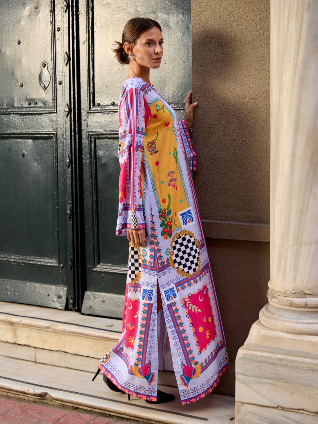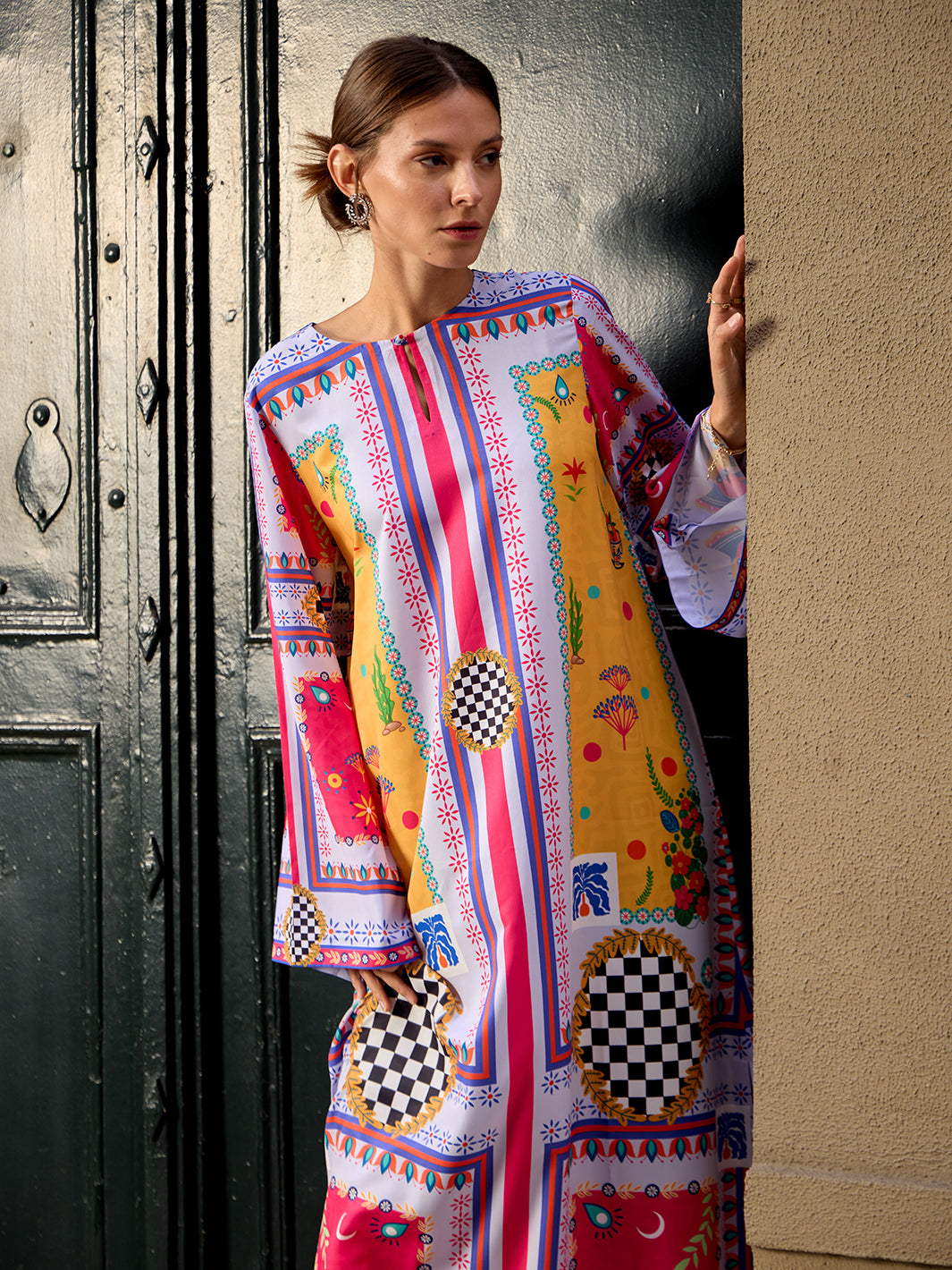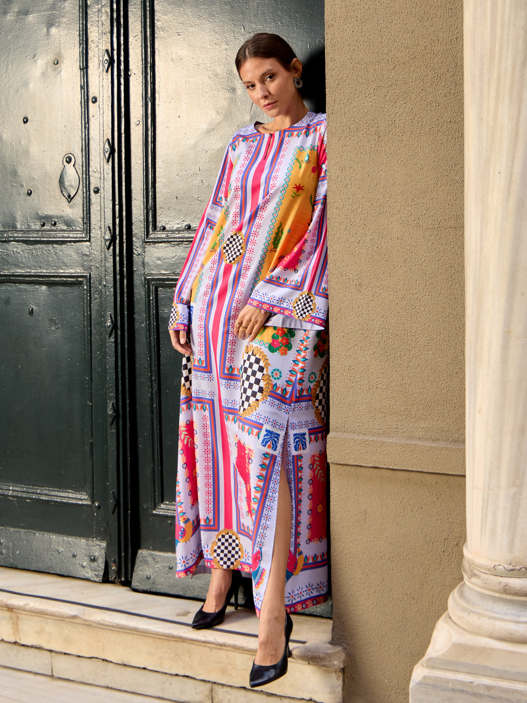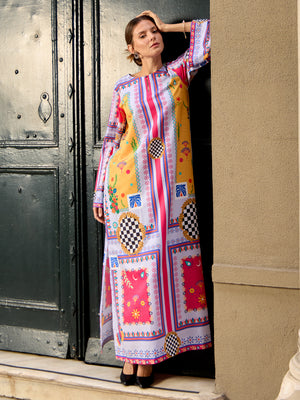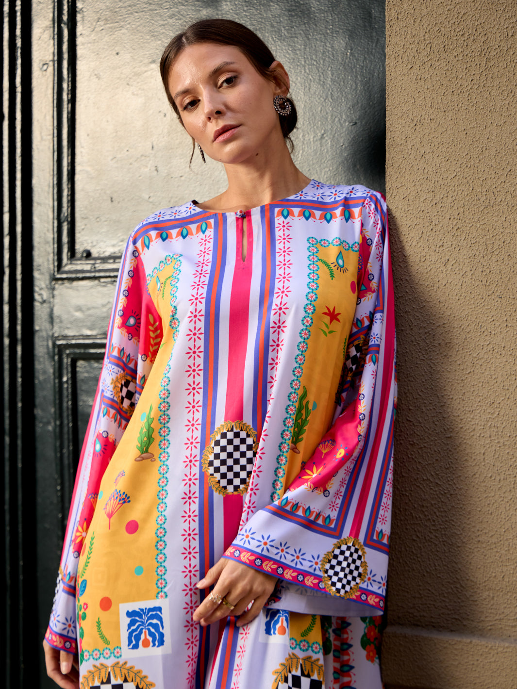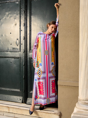 Make a bold impression with Corin, an eye-catching eastern women’s kaftan crafted in soft Crepe. The vibrant mix of pink, orange, and intricate motif detailing brings a touch of artistic flair to your look. With its fluid drape and relaxed fit, Corin blends comfort with confidence — perfect for festive fall gatherings, brunches, or evening wear with personality.