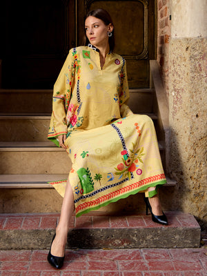 Embrace timeless elegance with Noen, a stunning eastern women’s kaftan crafted in luxurious Crepe. Featuring warm yellow tones with intricate artistic motifs, this design brings a touch of vintage charm with a modern twist. The flowing silhouette offers effortless comfort, making it perfect for fall gatherings, festive occasions, or relaxed evenings with poise and sophistication.