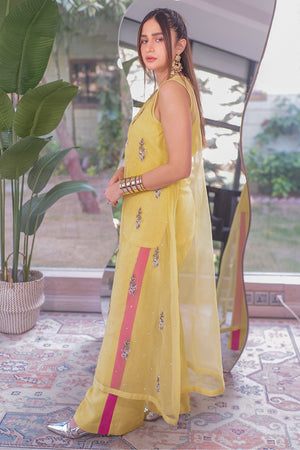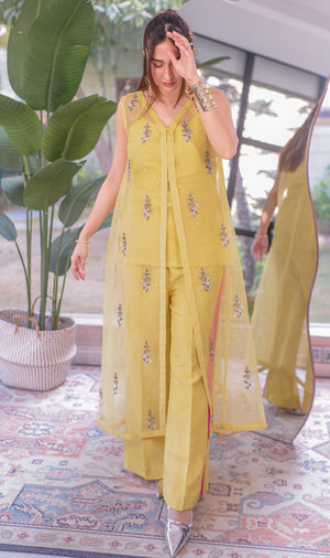 A Chic Rawsilk dress with Straight Korean Rawslk Trousers/Top and Viscose Organza Front Open Gown with Adda Details.