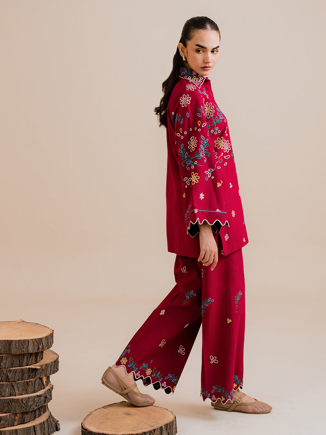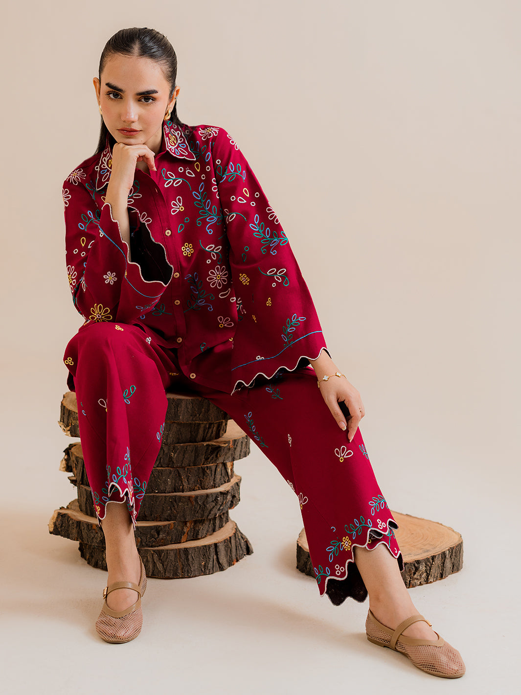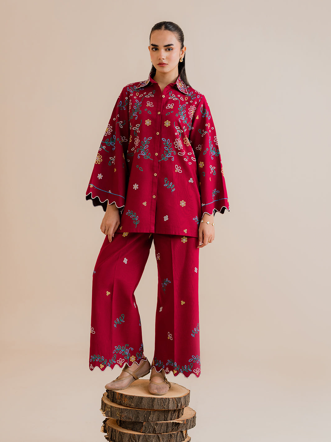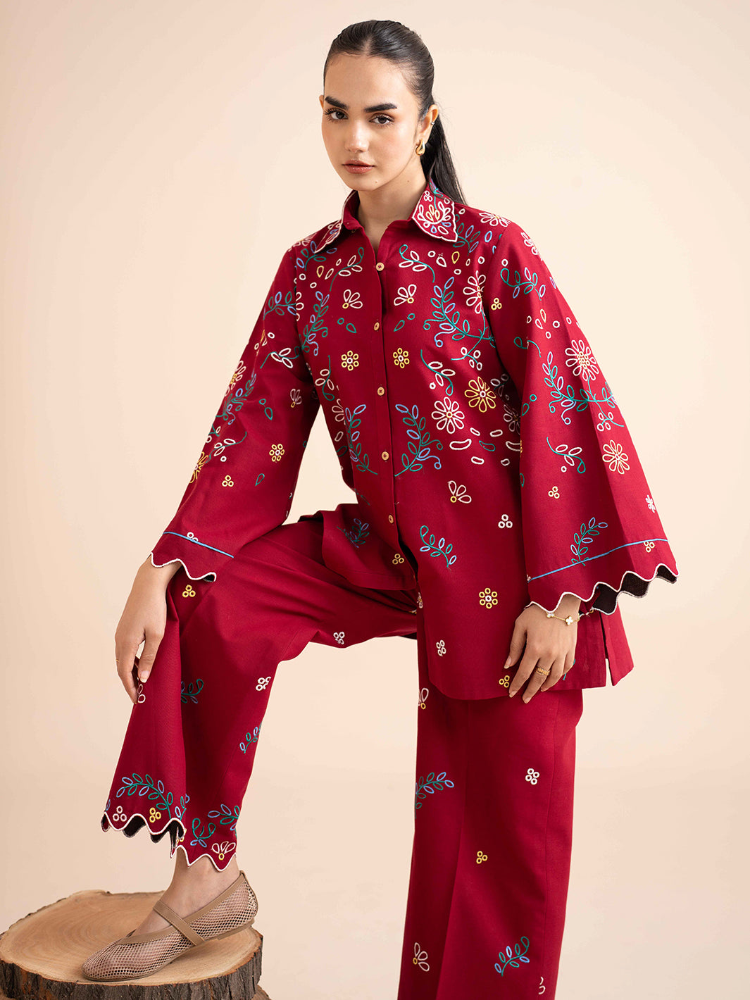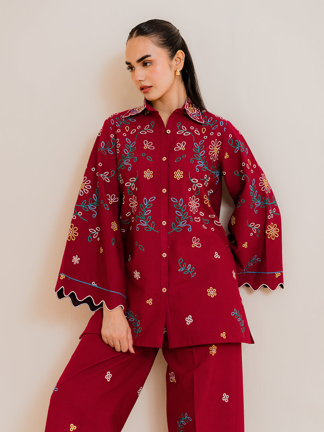 Upgrade your winter wardrobe with Lexa, a chic embroidered co-ord set designed for effortless everyday elegance. Featuring a short embroidered button‑down shirt paired with wide cullotte trousers, this look delivers style, comfort, and a refined modern silhouette.