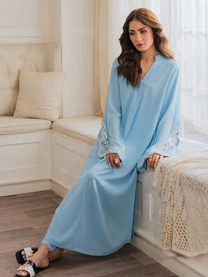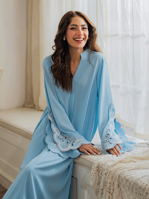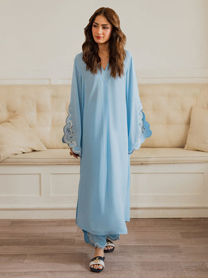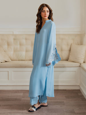 This enchanting 2-piece women's outfit is crafted from luxurious tropical georgette fabric, offering an exquisite drape and exceptional comfort. The serene sky blue Top features a relaxed, flowing silhouette with a sophisticated V-neckline. Its wide, bell-shaped sleeves are a focal point, adorned with intricate white floral and vine aari embroidery against a scalloped edge, adding a touch of delicate artistry. The ensemble is completed with matching straight-cut Trouser , also featuring subtle aari embroidery and scalloped detailing at the hem, creating a harmonious and elegant look. Perfect for both casual outings and special occasions, this outfit blends traditional charm with contemporary grace.
