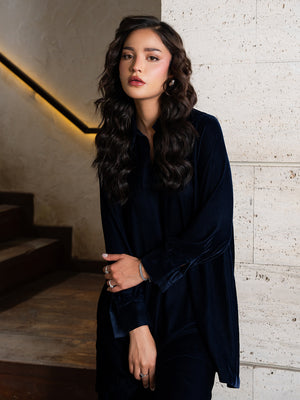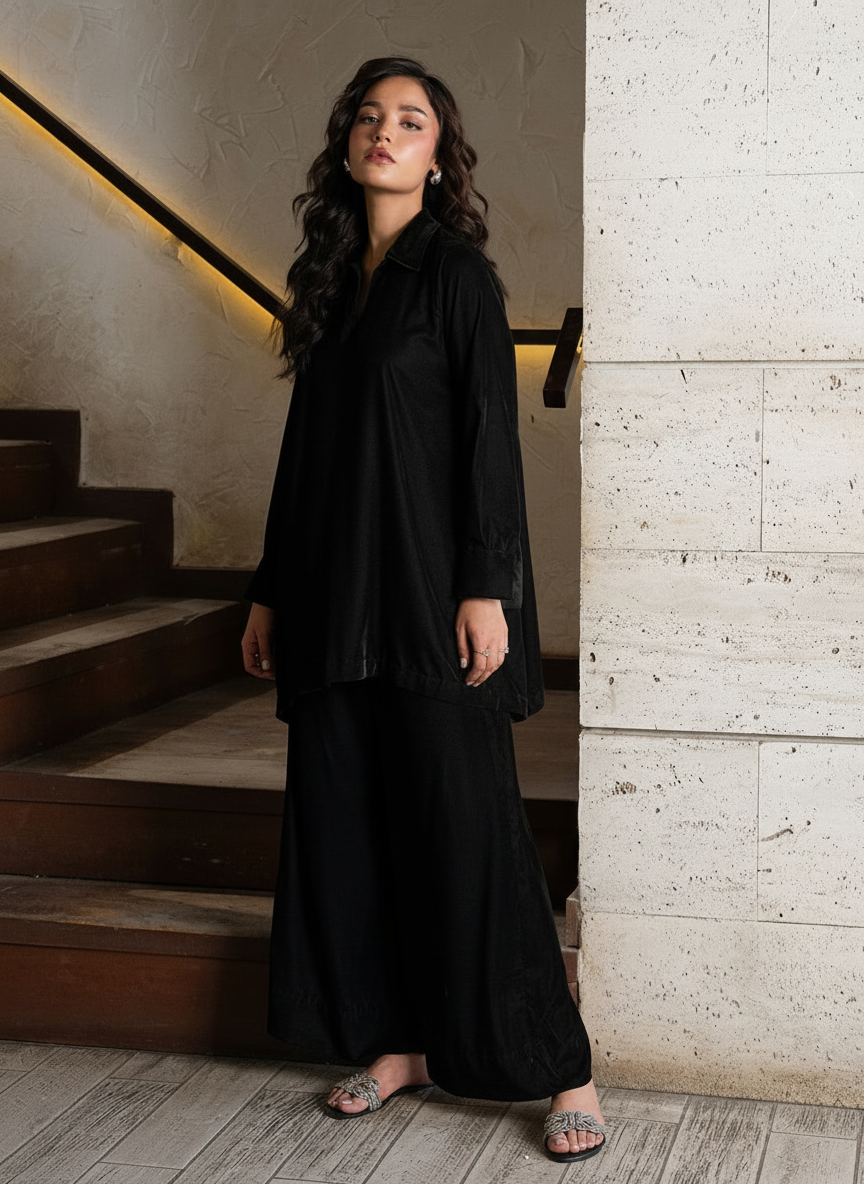 Step into modern elegance with the Nerral Velvet Set, crafted in luxurious Micro Velvet 9000 for a smooth, rich finish. The top features a classic collar with cuffed sleeves, designed in a loose-cut silhouette for effortless comfort. Paired with flared trousers with side slits, this two-piece set offers graceful movement and sophisticated style — perfect for casual outings, gatherings, or elevated everyday wear.