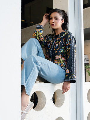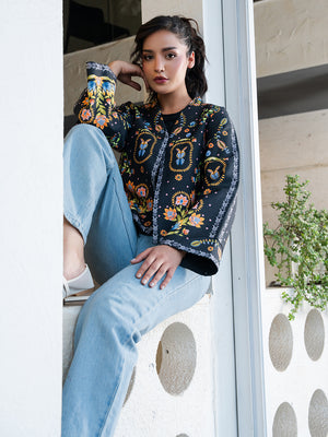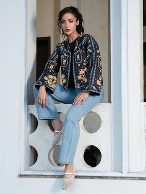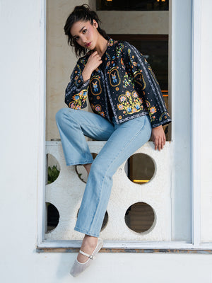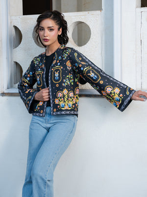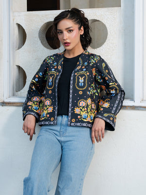 Upgrade your style with Maleni, a statement printed jacket crafted for bold, artistic fashion lovers. Designed with a charcoal black base, this jacket features multicolor floral digital prints, a boxy silhouette for easy layering, wide embroidered‑style sleeves, and an open‑front design — giving you a perfect blend of comfort and contemporary elegance. Ideal for casual outings, winter styling, and elevated everyday looks.