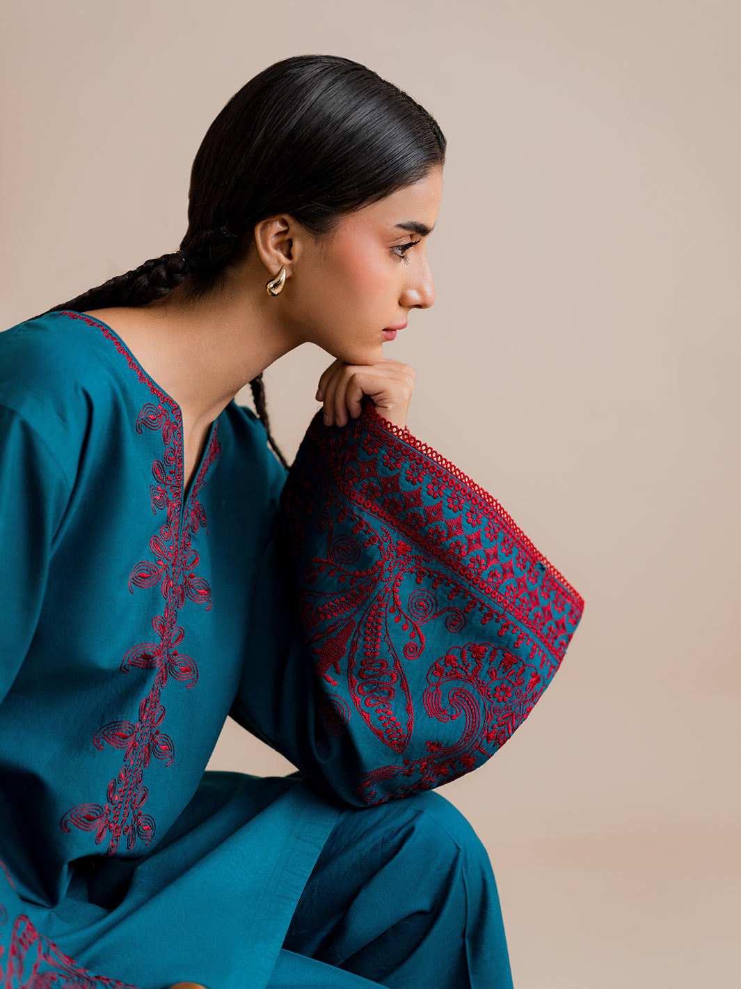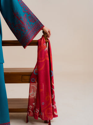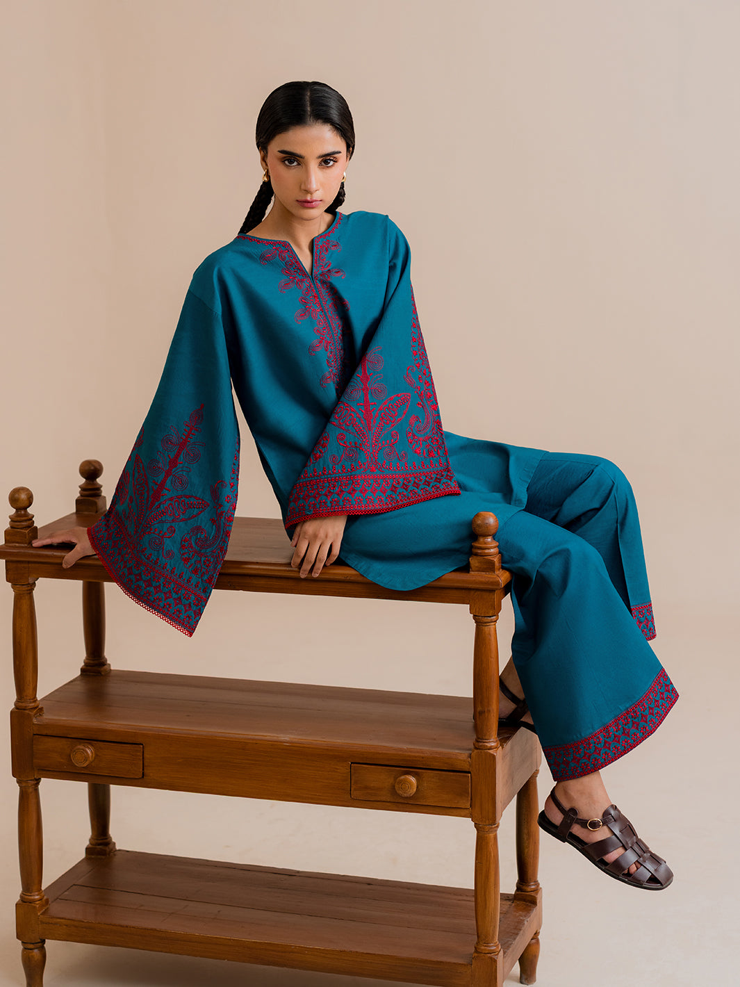 Refine your winter wardrobe with Morin, an elegant embroidered 3 Pc set crafted to offer style, warmth, and effortless sophistication. Designed in a soft teal tone the outfit features a straight shirt with a round hem and flared sleeves, paired with embroidered culotte pants for a graceful, elongated silhouette. Perfect for winter outings, office wear, and semi-formal gatherings.