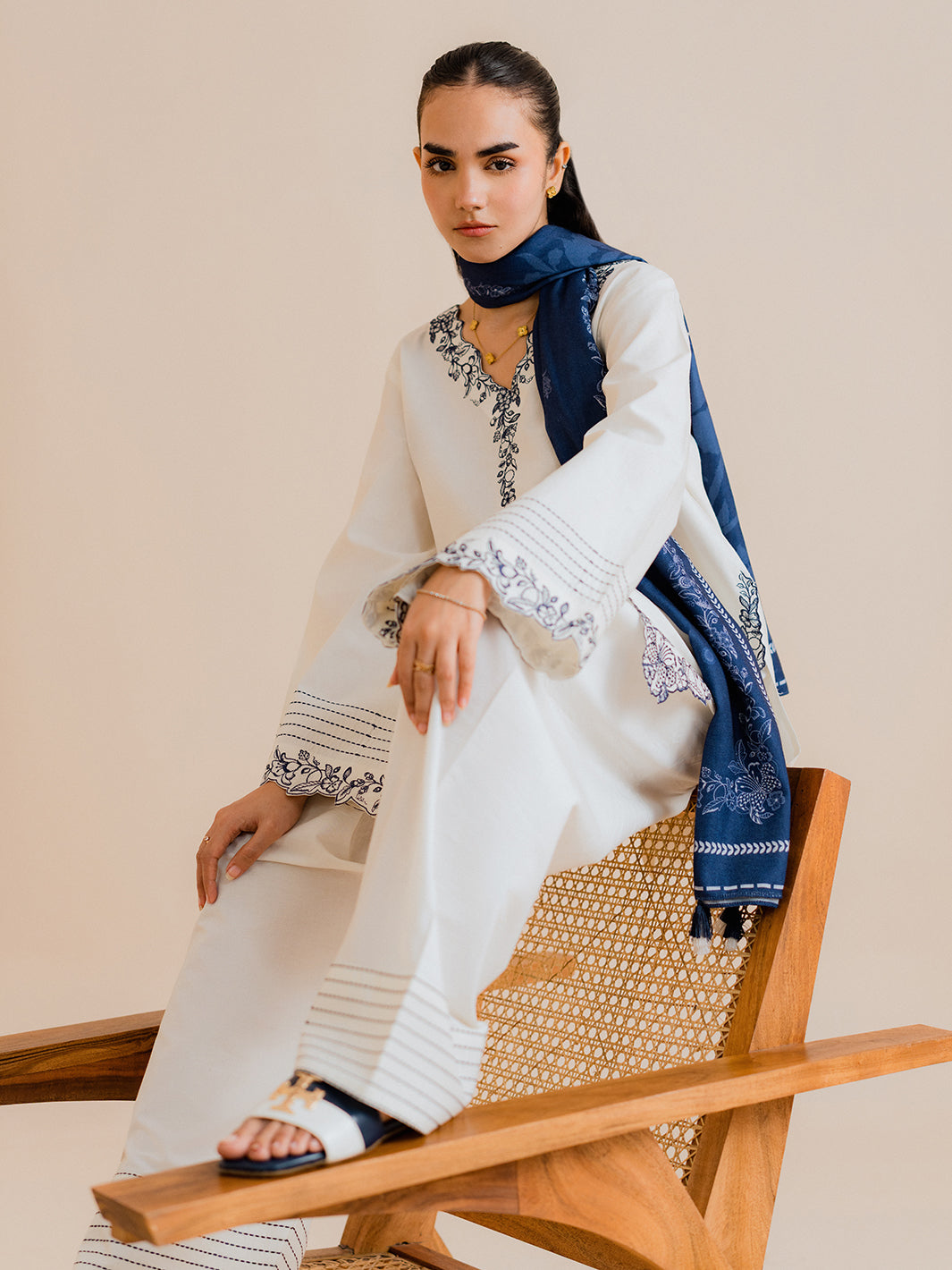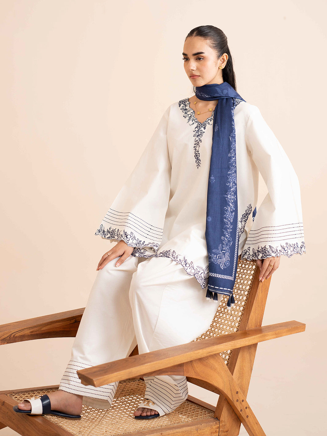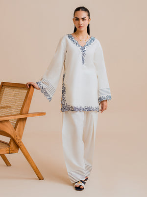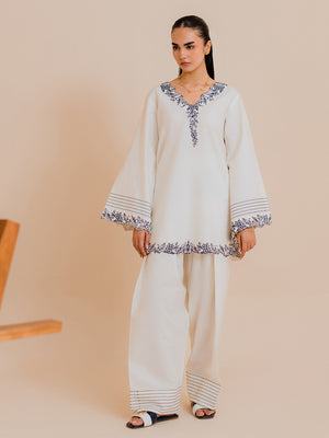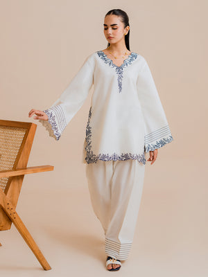 Elevate your winter wardrobe with Vaylo, a beautifully embroidered 2‑piece co‑ord set designed to bring effortless elegance to your everyday style. The short shirt features flared sleeves and a delicately embroidered V‑neck, paired with a stylish farshi shalwar adorned with embroidered hem detailing, offering a perfect blend of tradition and modern chic.