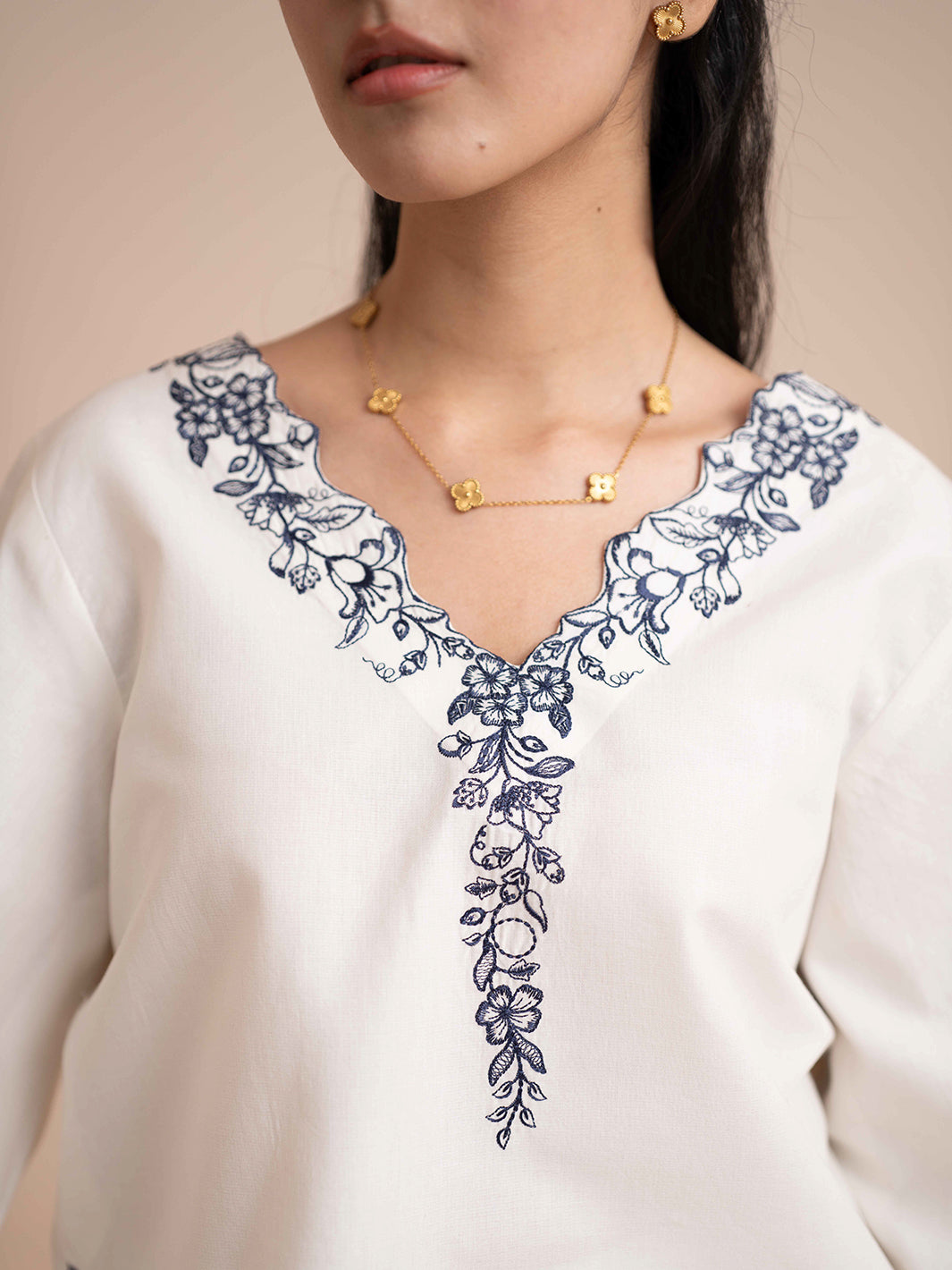 Top: short shirt with flared sleeves and embroidered V‑neck