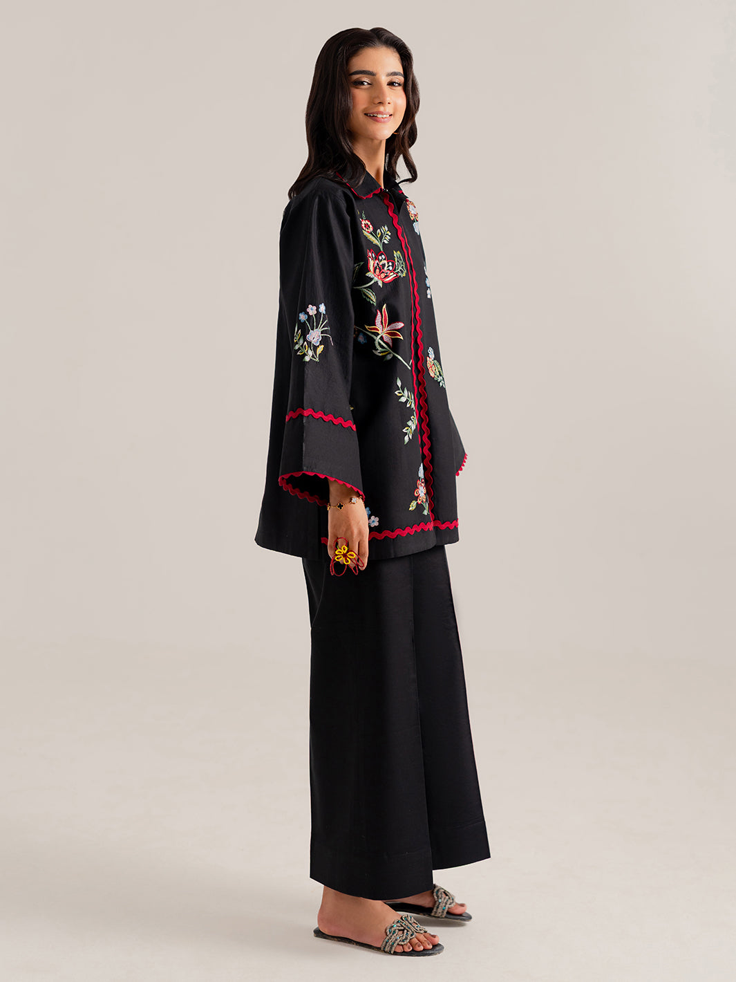 Elegant and refined, this black embroidered set is a summer essential. Adorned with delicate pastel-toned embroidery and a classic scallop laced hemline, it’s designed for effortless style. Perfect for casual outings or evening gatherings.