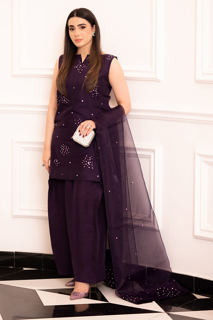 Amethyst Glow in straight cut shirt short shirt with Farshi Shalwar. Embellished with crystals, sitaray and cut dana in a beautiful bunch spray formation giving it the fashionista vibe you're craving for.