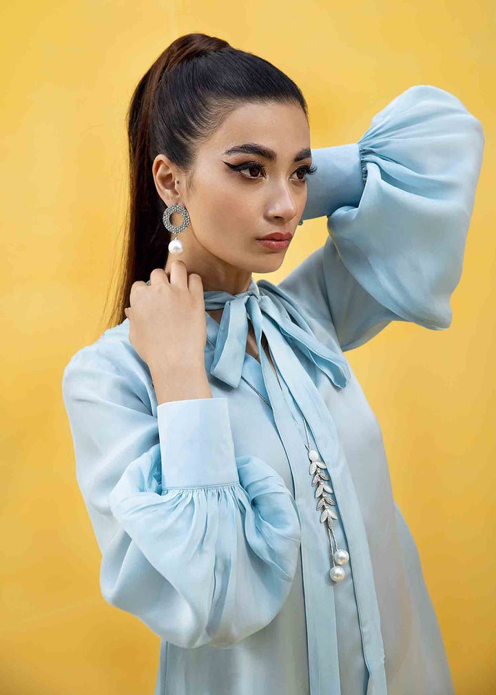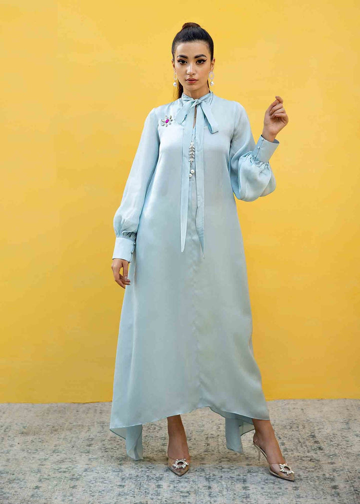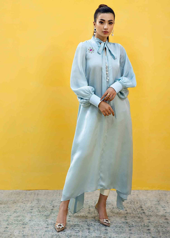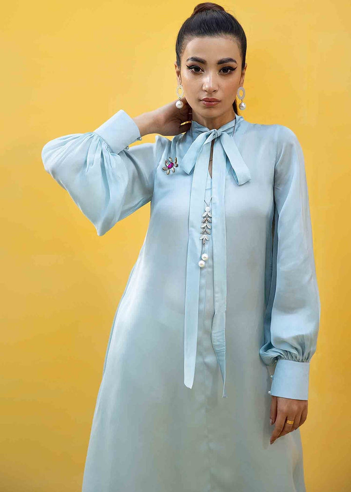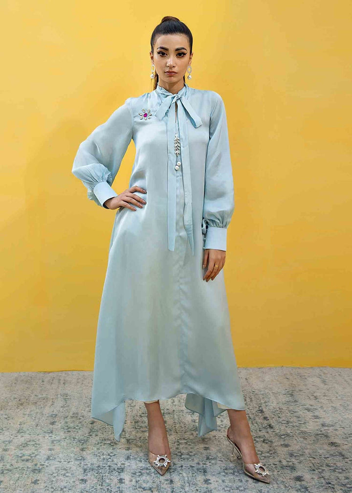Angels light is a perfect outfit for any friends gathering. It is a long flowy shirt having ban and bow details at the neckline. Cuffs and buttons at the sleeves along with the embellished flower on the side make it a trendy outfit.