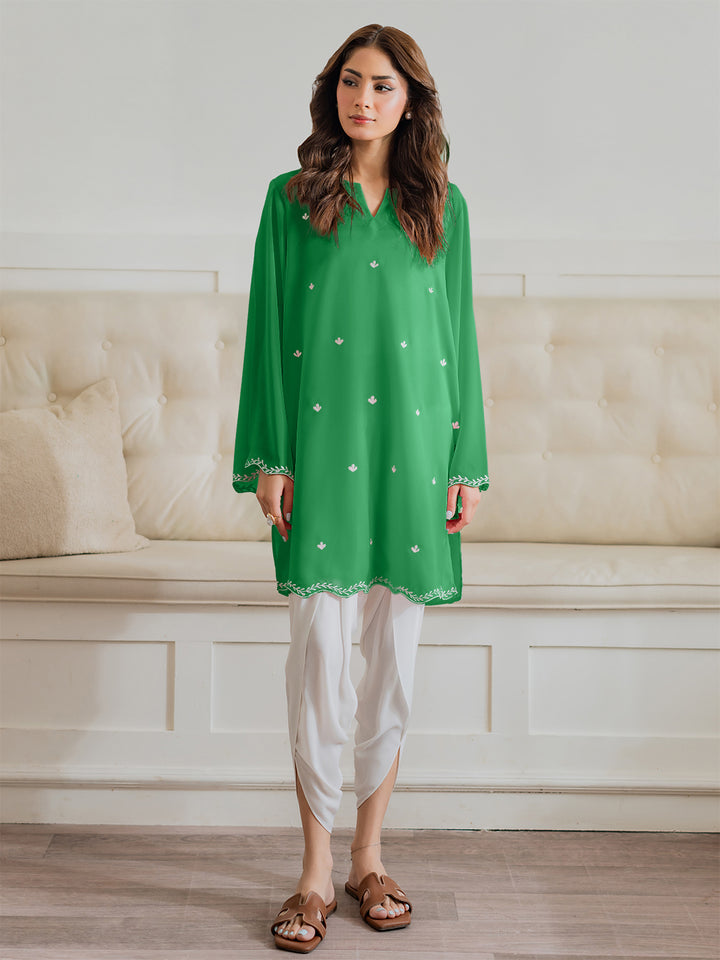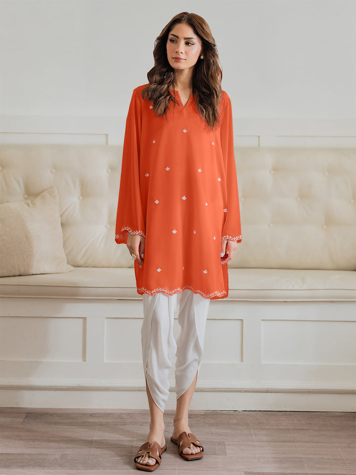 This 2-piece women's outfit brings together effortless charm and comfort, designed in soft tropical georgette fabric. The pastel pink Top features subtle embroidered motifs and scalloped detailing on the sleeves and hemline, enhancing its delicate and feminine appeal. It comes paired with elegant white tulip Shalwar that add a modern twist to traditional styling. Ideal for daily or basic wear, this outfit offers lightweight comfort with a graceful finish.