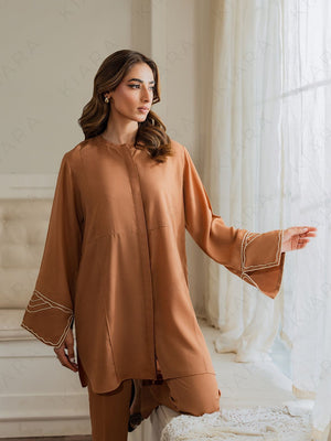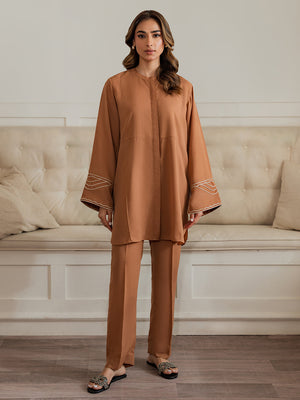 This 2-piece women's outfit brings together effortless charm and comfort, designed in a soft, flowing georgette fabric. The brown Top features subtle white embroidered or stitched detailing on the sleeves, enhancing its delicate appeal. It comes paired with elegant straight pants that add a modern twist to traditional styling. Ideal for daily or basic wear, this outfit offers lightweight comfort with a graceful finish.