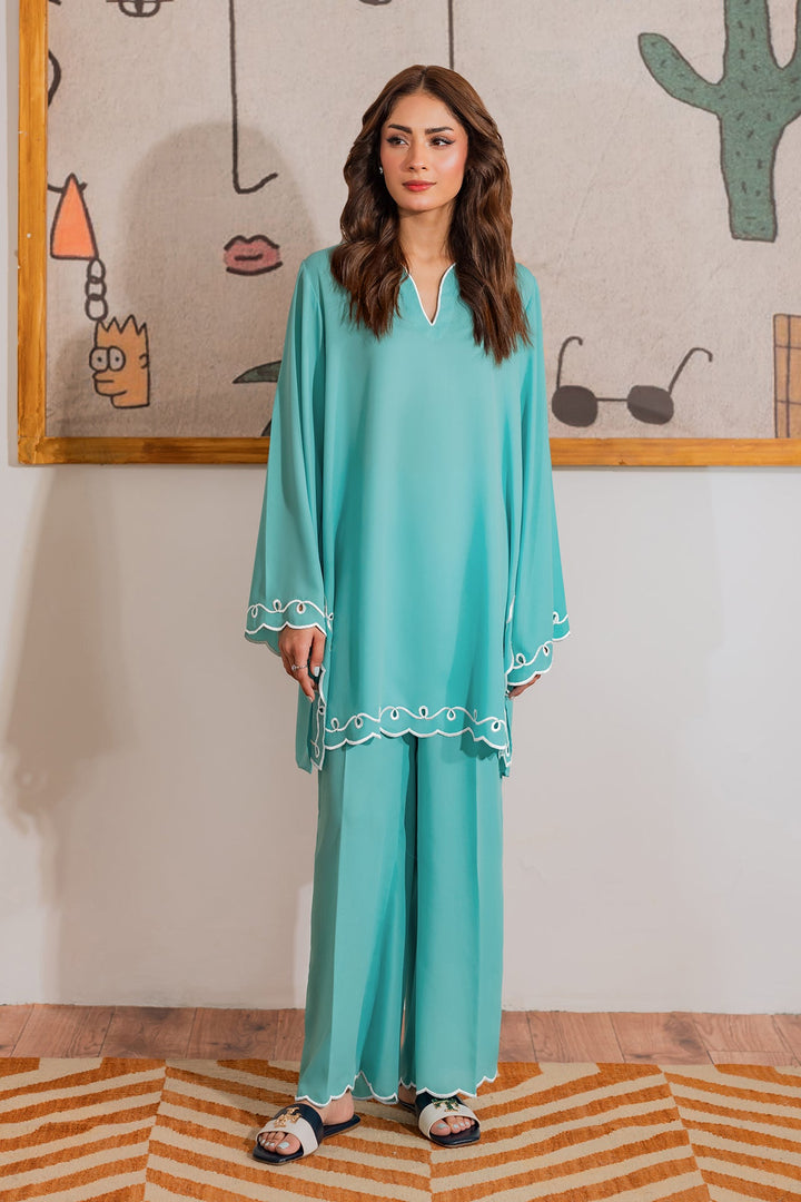 This elegant 2-piece women's outfit is crafted from soft tropical georgette fabric, offering both comfort and a graceful drape. The aqua blue Top features a relaxed fit with a stylish V-neck. Its wide sleeves and hemline are beautifully adorned with intricate white scalloped embroidery, adding a touch of delicate charm. The outfit is completed with matching wide-leg Culottes that complement the relaxed silhouette of the Top. Ideal for daily or basic wear, this ensemble provides lightweight comfort with a chic and effortless finish.