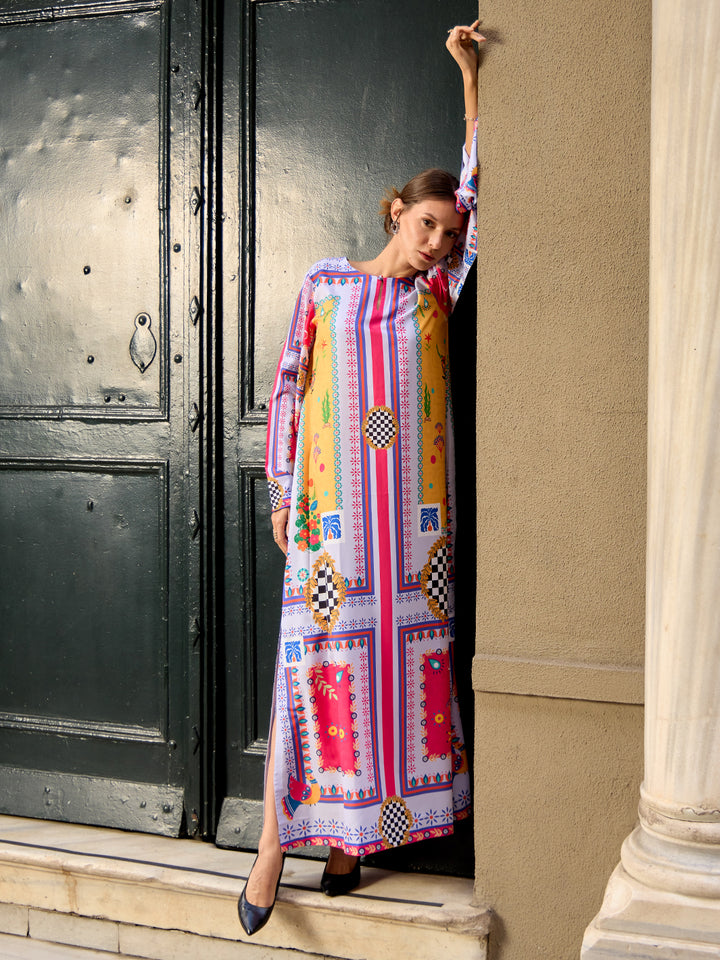 Make a bold impression with Corin, an eye-catching eastern women’s kaftan crafted in soft Crepe Polyester. The vibrant mix of pink, orange, and intricate motif detailing brings a touch of artistic flair to your look. With its fluid drape and relaxed fit, Corin blends comfort with confidence — perfect for festive fall gatherings, brunches, or evening wear with personality.