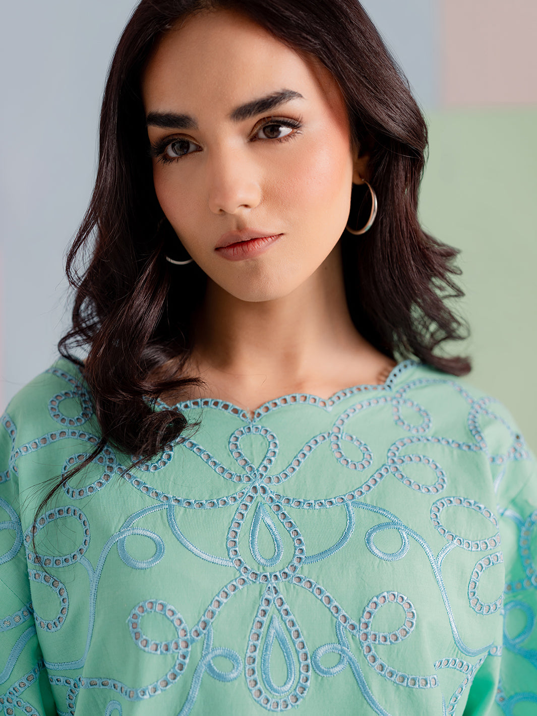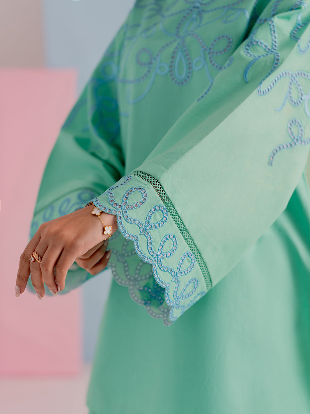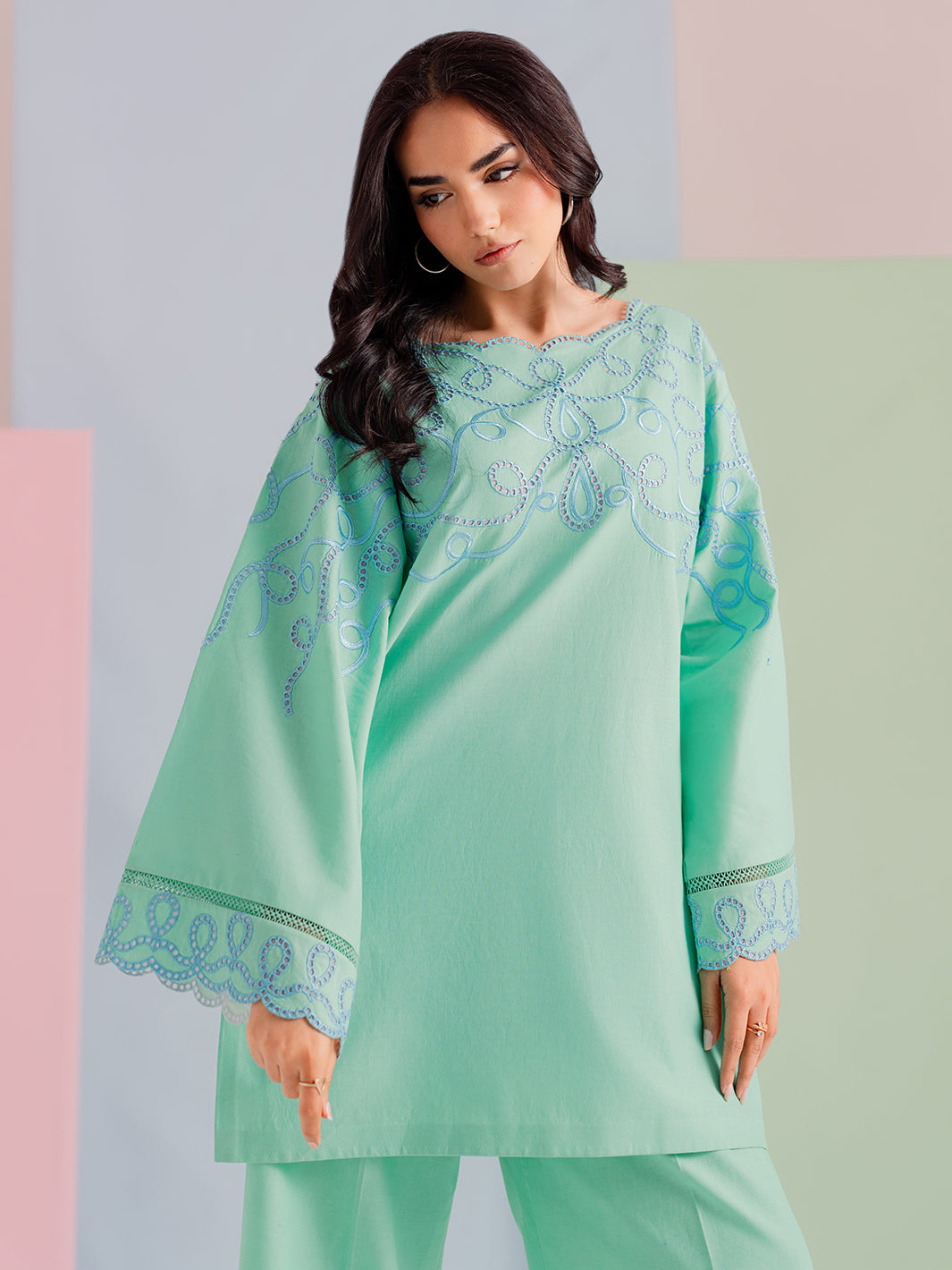 Details: Intricate floral embroidery on sleeves and hemline with premium scalloped border detailing.