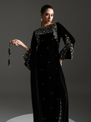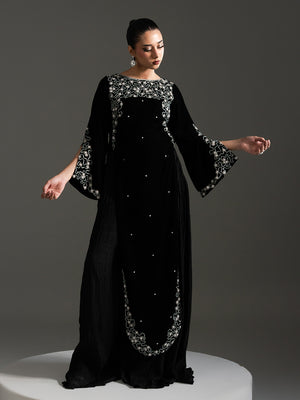 Embrace classic glamour with the Mahveen Gown, a timeless piece crafted from luxurious Micro Velvet 9000 in rich midnight black. This exquisite, floor-length gown features a flattering straight silhouette with a modest neckline. The garment is lavishly adorned with heavy antique silver/white tilla and bead Embellished , beautifully framing the neckline, cuffs, and a bold motif sweeping across the hemline. With subtle, all-over scatter embellishments, Mahveen is the definition of sophisticated elegance, perfect for the most exclusive winter occasions.