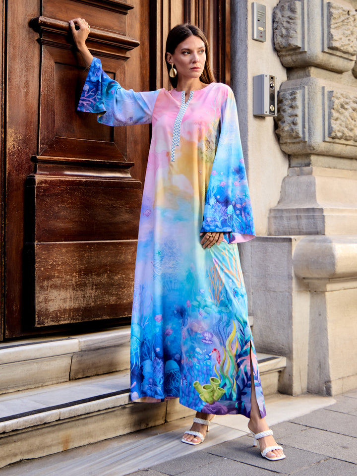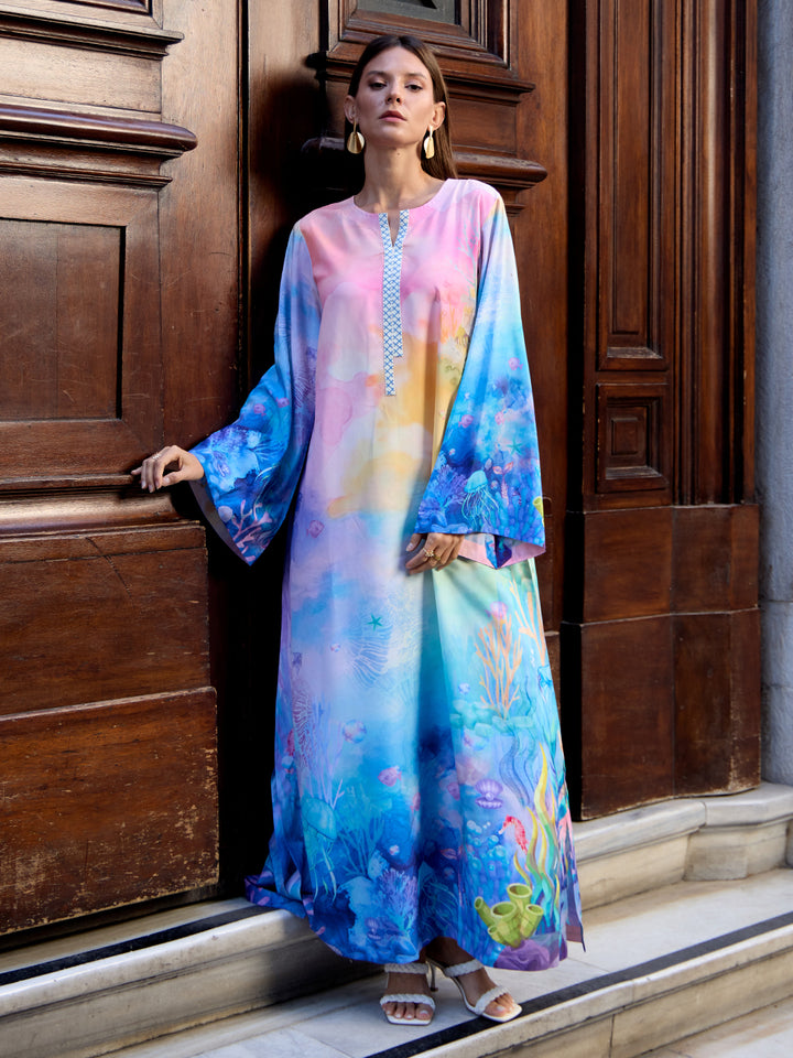 Embrace artistic elegance with Maren, an exquisite eastern women’s kaftan crafted from luxurious Crepe. The design features a dreamy watercolor blend of soft blue, peach, and lilac tones that flow beautifully across the fabric. Its relaxed silhouette ensures effortless comfort, making it an ideal choice for fall gatherings, casual outings, or evening wear with a graceful touch.