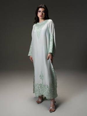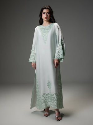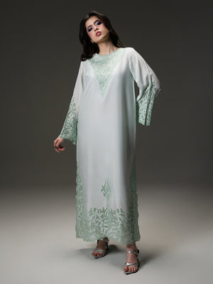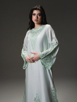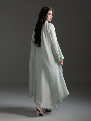 Exude effortless poise in Mint Frost, a masterpiece of tonal artistry from the Petaline collection. This ensemble is meticulously tailored from premium Rawsilk, providing a rich, structured silhouette with a subtle, sophisticated luster. The shirt features masterful applique and cutwork along the hemline and sleeves, creating a delicate, lace-like transparency that is further elevated by intricate hand-embroidery (EMB). The look is completed with a gossamer Organza dupatta. Mint Frost is the perfect fusion of traditional craftsmanship and modern minimalist chic.