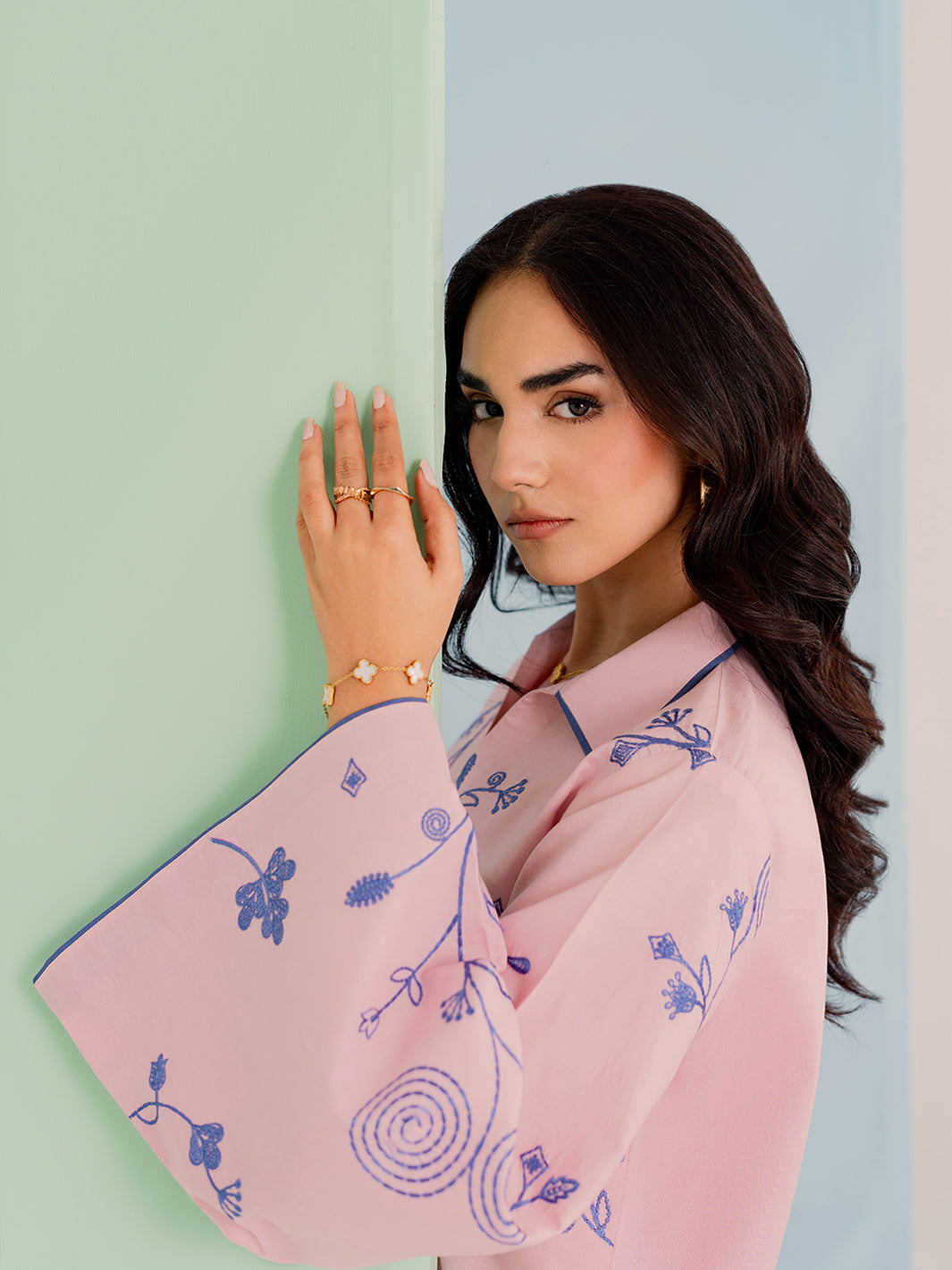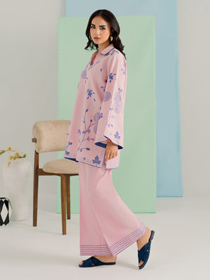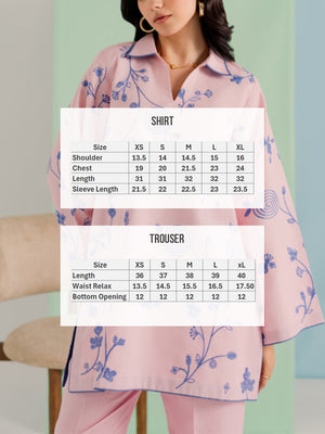 Bottoms: Complemented by matching blush pink wide-leg trousers adorned with subtle linear embroidery at the hem for a cohesive finish.