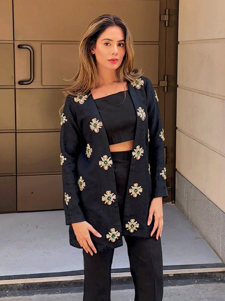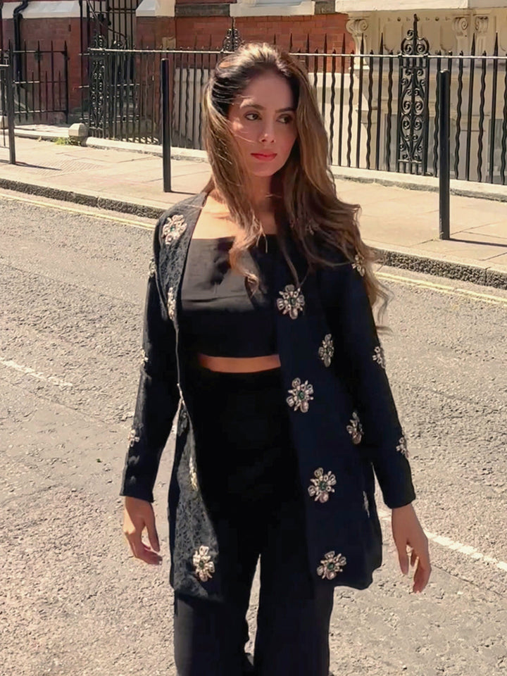Turn heads with our Noir Set, a chic and contemporary ensemble designed for the modern muse. This black thres-piece set features a tailored longline jacket adorned with intricate floral embellishments crafted from pearls, stones, and metallic accents. The boot-cut pants and matching black crop top offer a sleek silhouette that’s both timeless and trend-forward.
