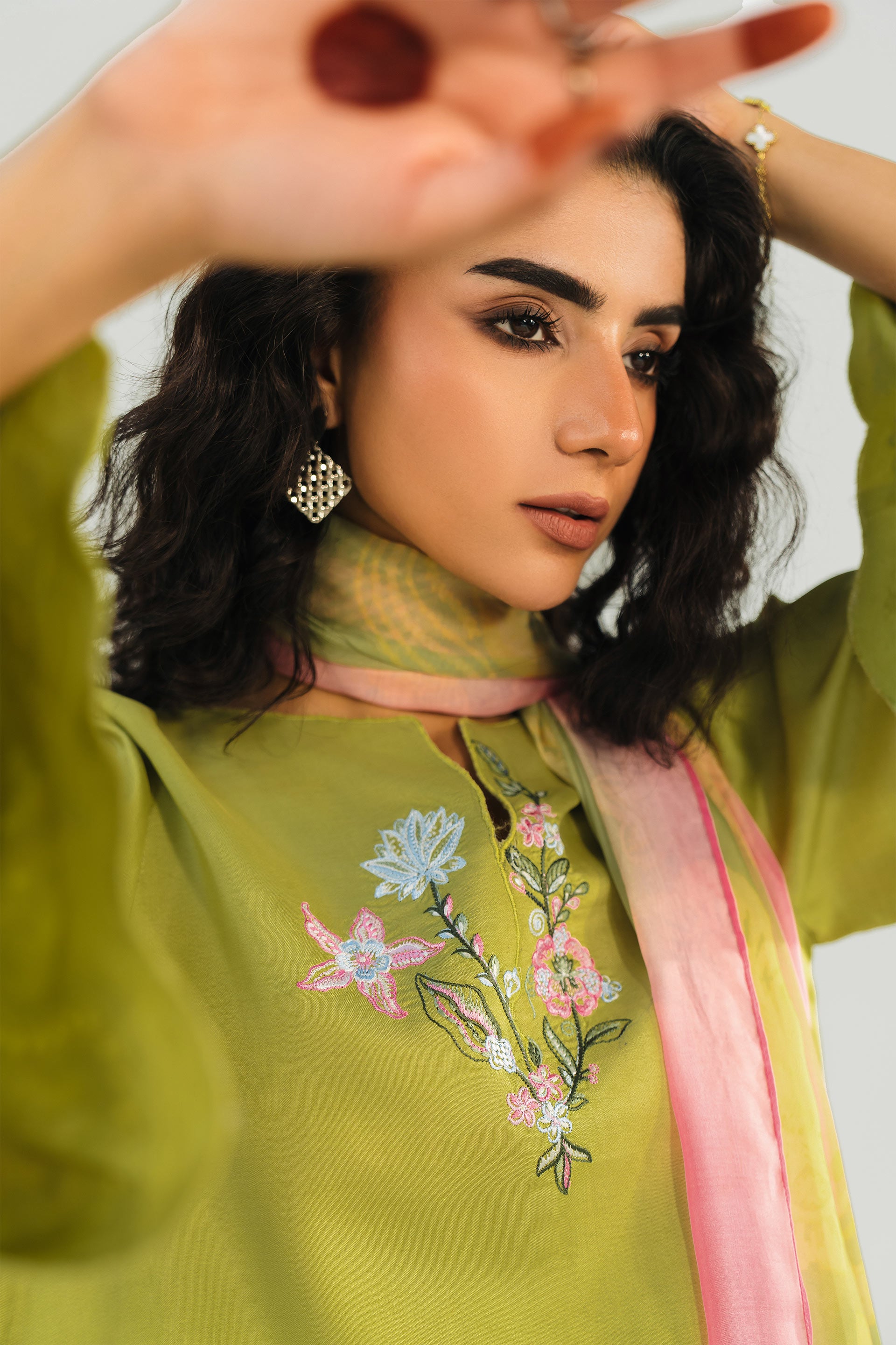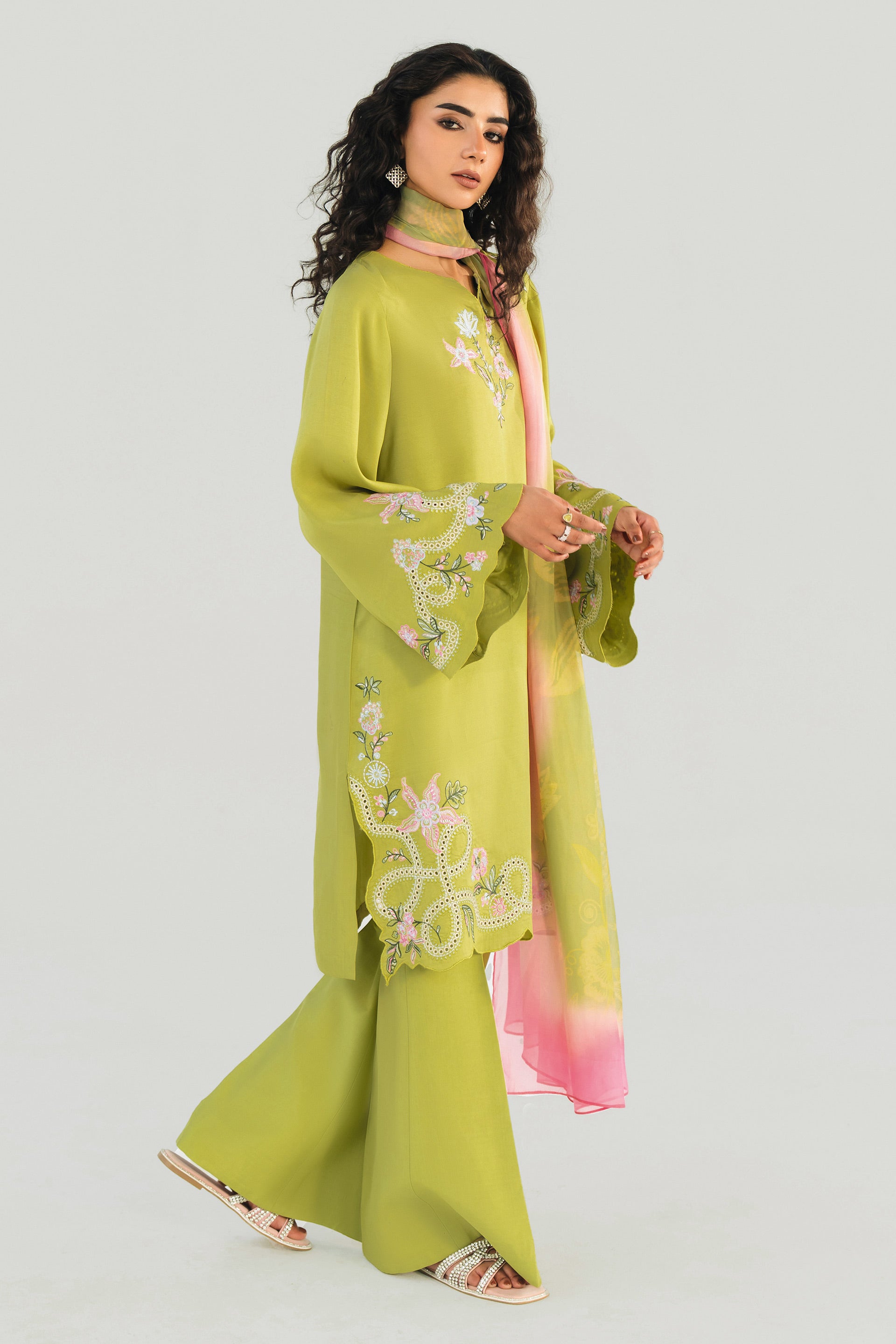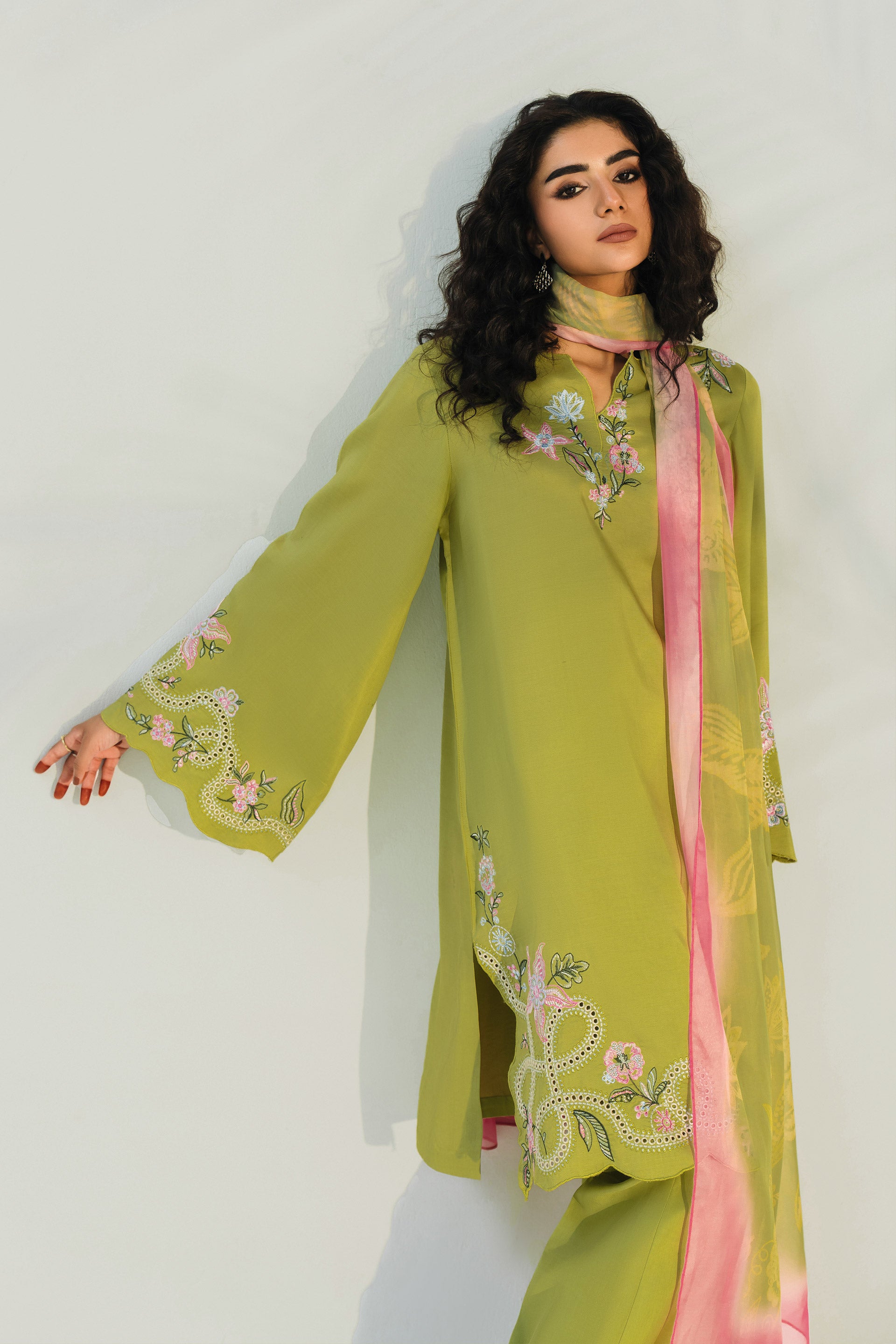 Matt Khaddi Silk, Medium Silk Dupatta, Eid Collection 2026, Olive Lime Embroidered Suit, Silk Pret Pakistan, Scalloped Co-ords, Designer Eid Wear.