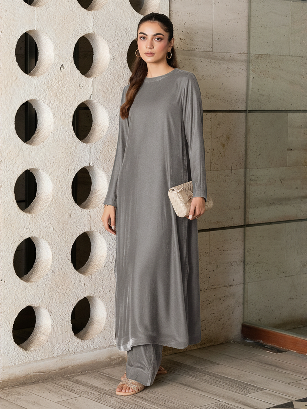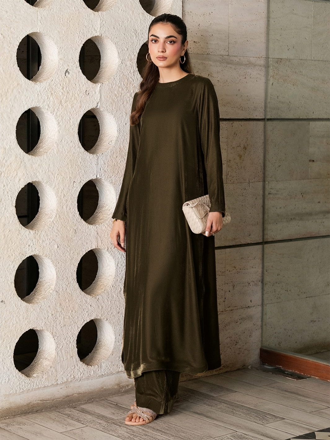 Experience refined elegance with the Omera Velvet Set, crafted from luxurious Micro Velvet 9000 for a smooth and graceful drape. The top features a round-cut kaftan silhouette with sleek sleeves, offering a modern yet modest look. Paired with straight loose pants, this two-piece set delivers effortless sophistication for daytime outings, casual gatherings, and evening wear.