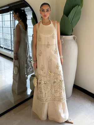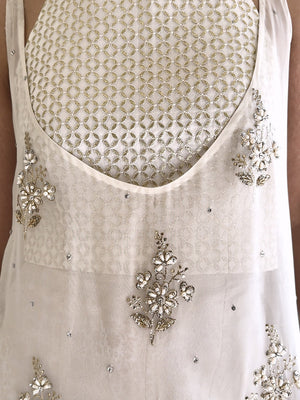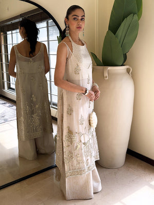 Shirt features delicate zari, sitaray, stone , threadwork, and sequin detailing on Pure Viscose Indian Organza fabric. Panni work, tilla and Resham yarn make up the beautiful story of the outfit.