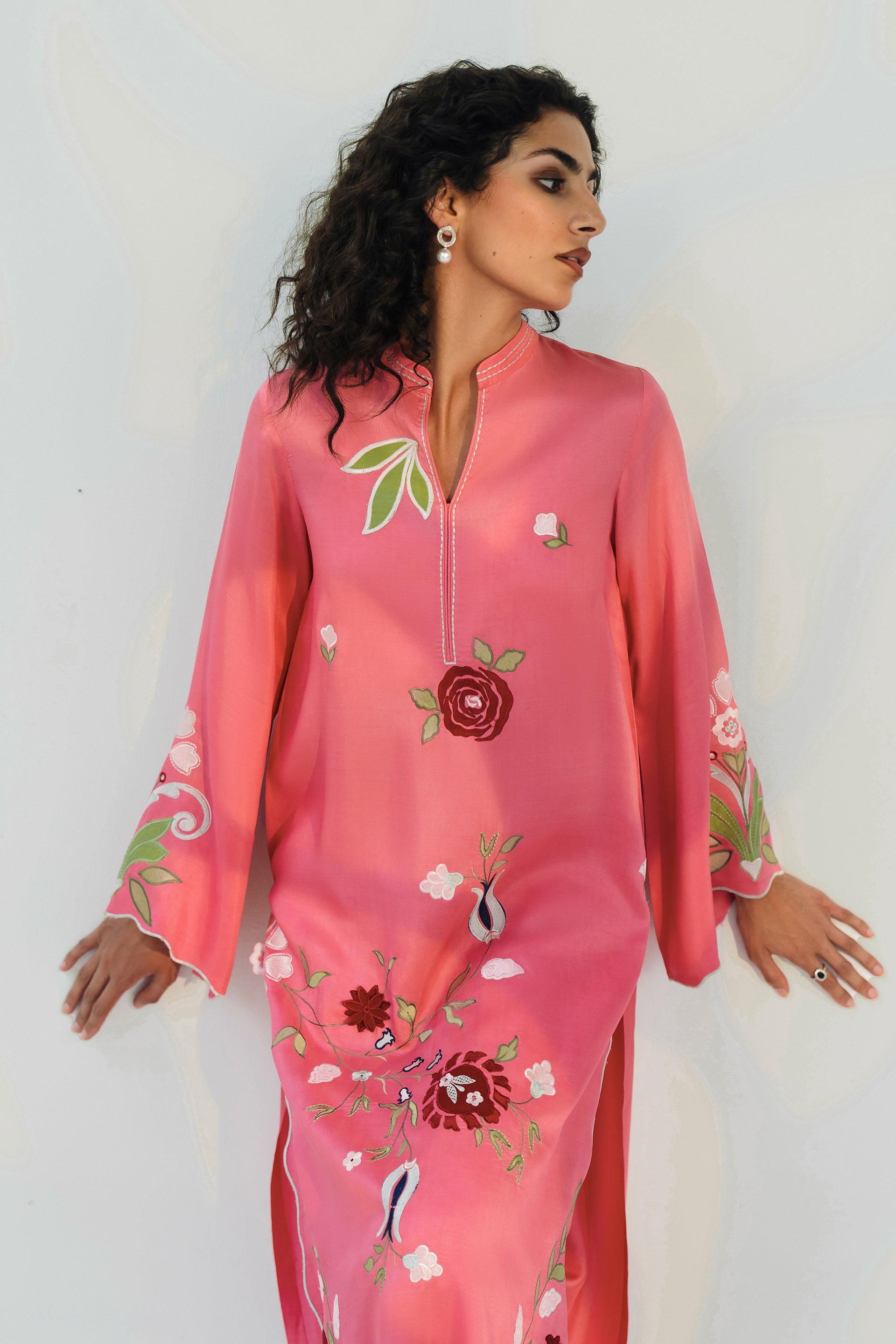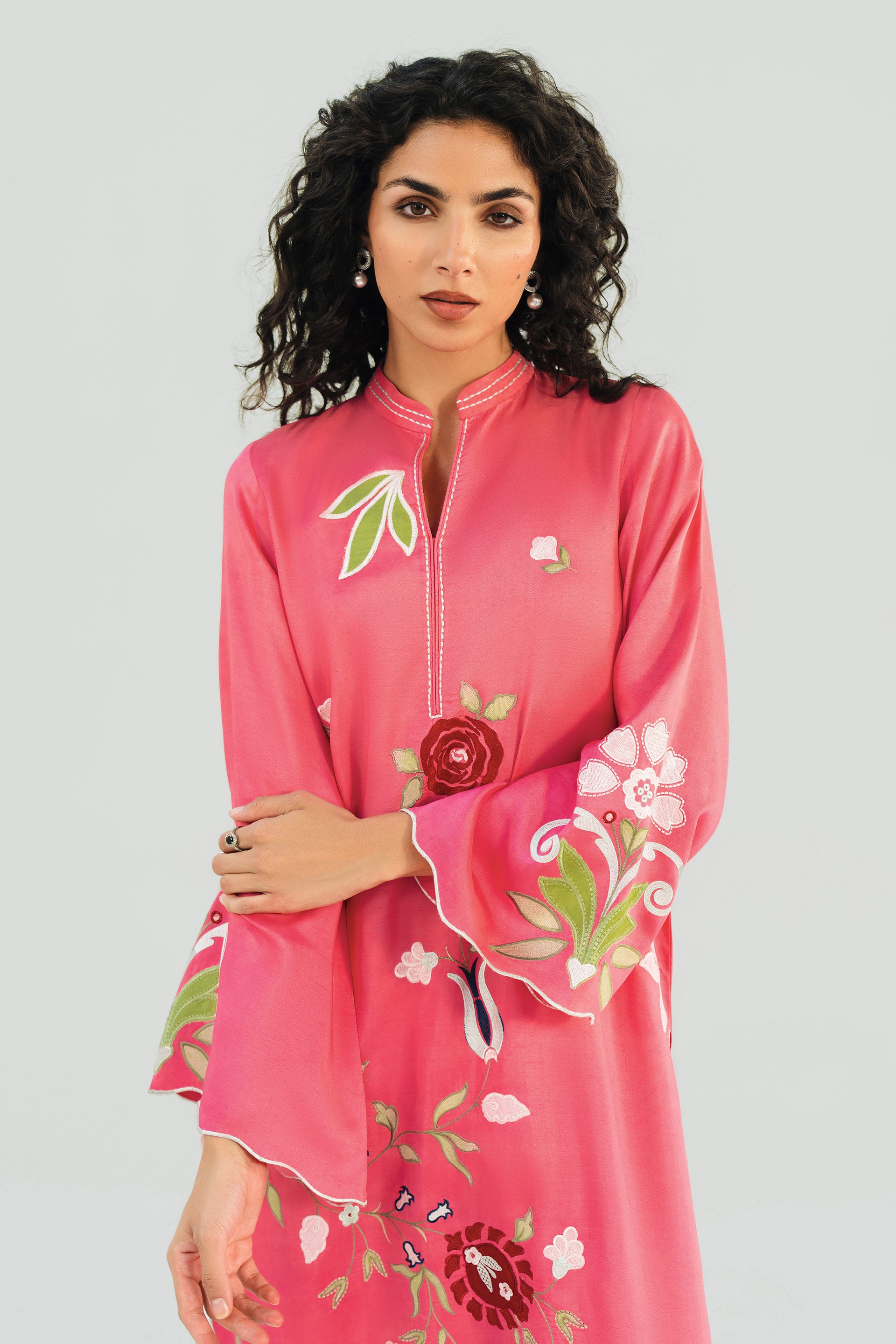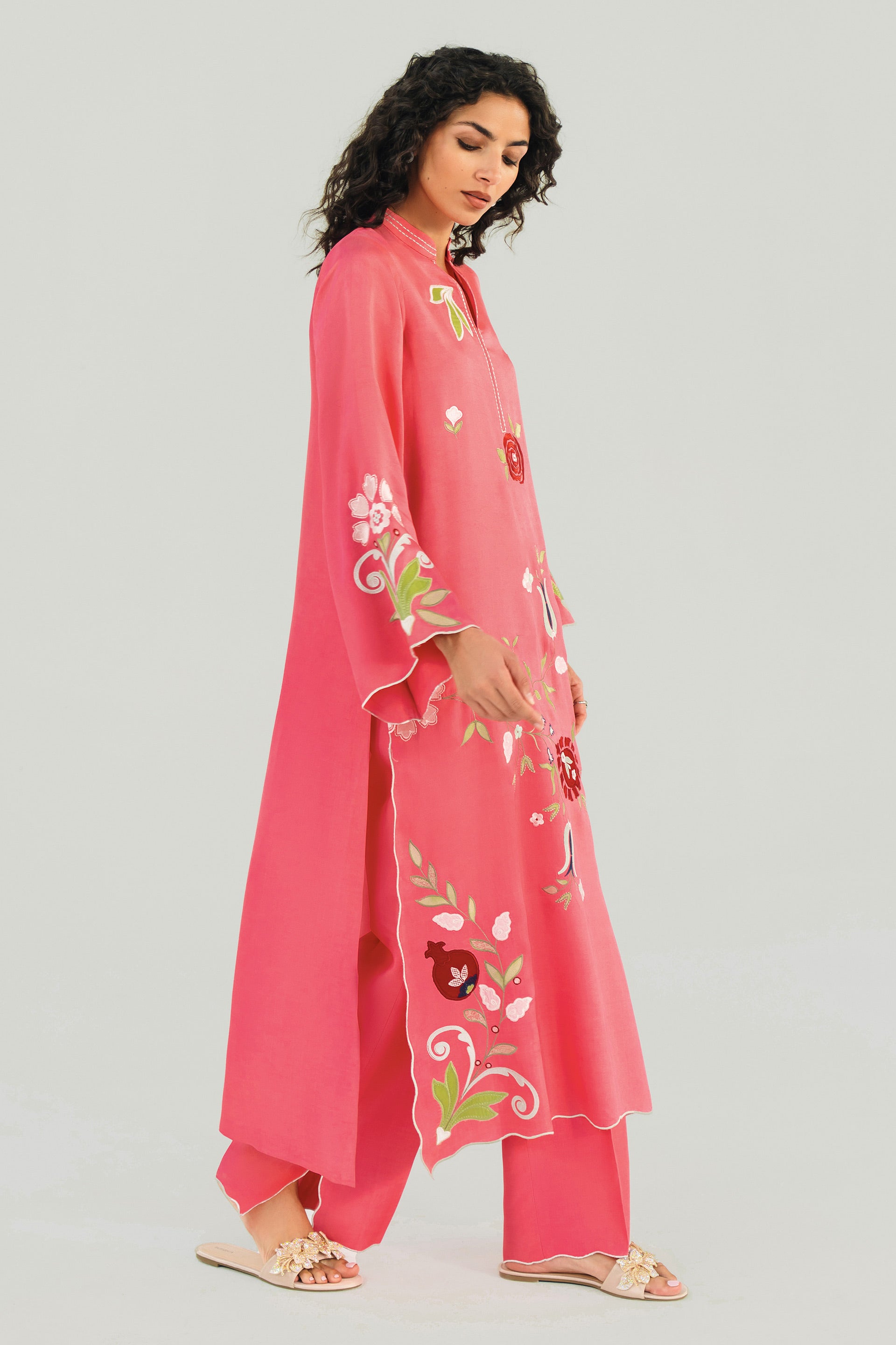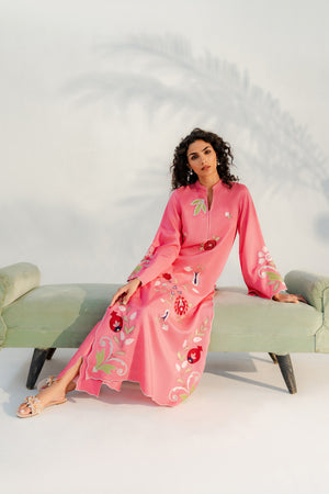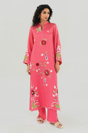 Embrace the joy of the season with our Pink Matt Khaddi Silk ensemble. This piece is a celebration of fine craftsmanship, featuring a long-line tunic adorned with vibrant, multi-colored floral and applique work of pomegranate motifs that evoke the beauty of a spring garden.