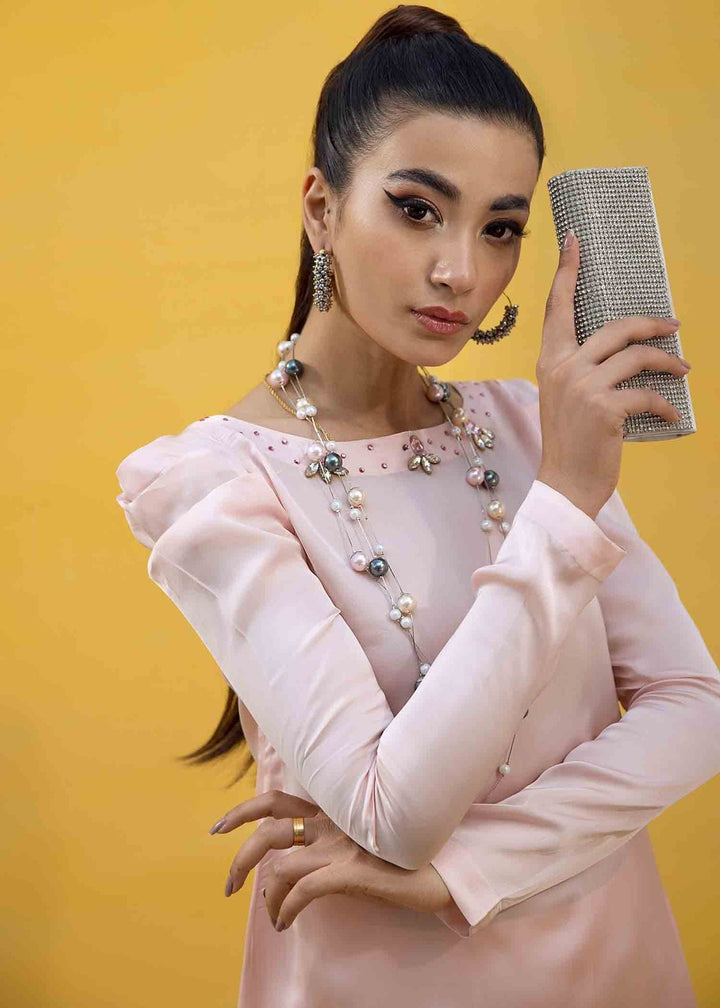 Rose water is a panelled shirt made in light pink organza satin. The sides are closed to give a frock look.It has layered sleeves and round hand embellished neckline. Long loose fit trouser with piping details at the side seams is paired with it.