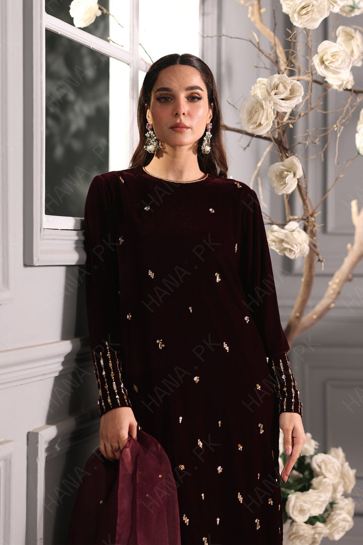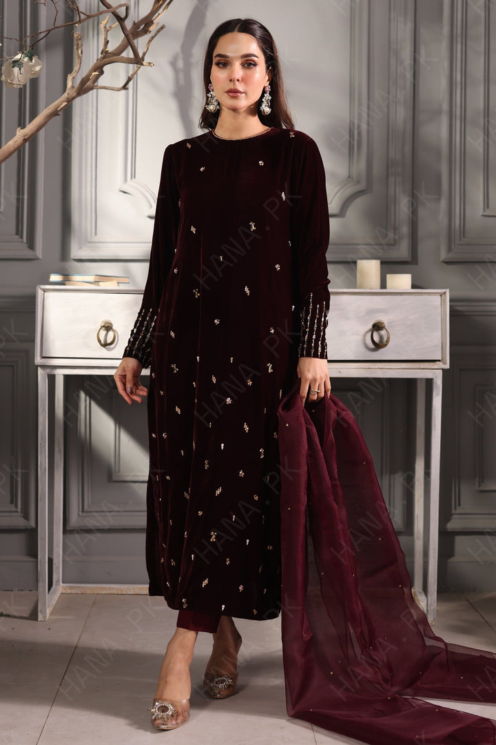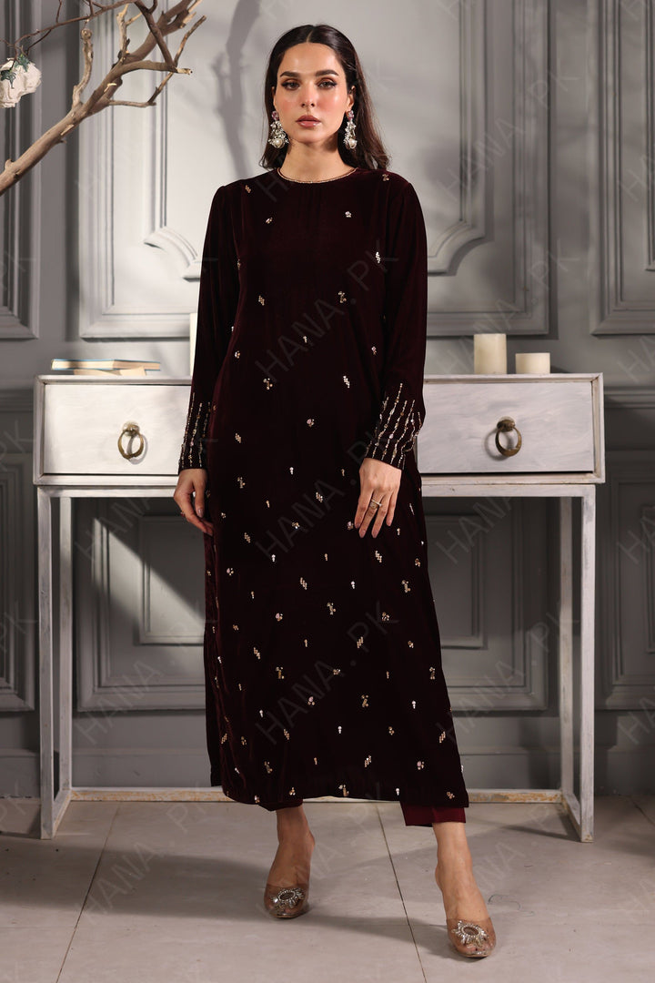 A classic pick for an evening out, this trendy velvet outfit is a long dress featuring round neck, sleek sleeves and Tappered Korean Rawsilk Trouser. Wear it with a dupatta and you're all set for a family gathering. Style it without dupatta and you've got the perfect look for a dine out/night out or for crashing that perfect party.
