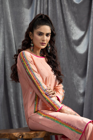 Salmon is a stitched peach raw silk dress having delicate ada details arrangements on the princess panels and sleeves. The outfit is decorated with fabric manipulation and sequins. Paired with boot leg pink raw silk pants having shocking pink edging makes it an ideal outfit for curated seasonal celebrations.