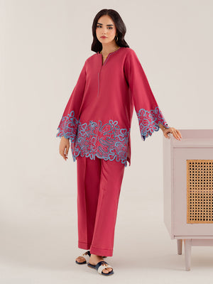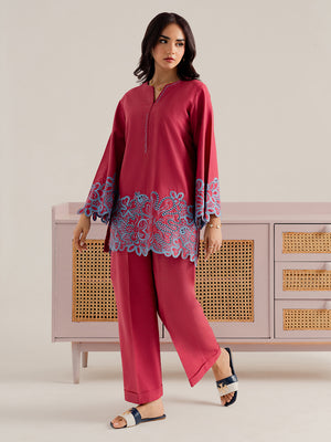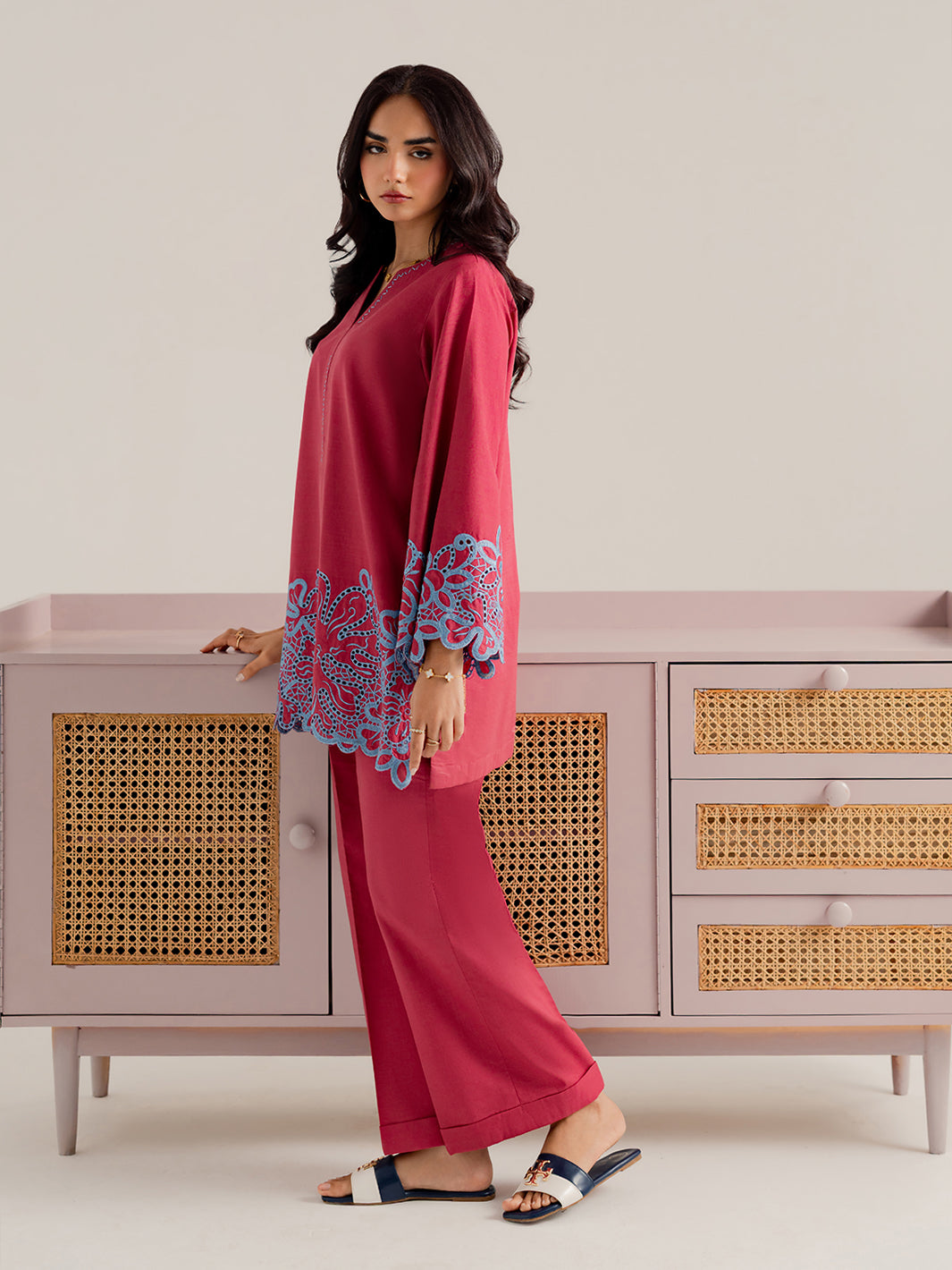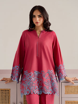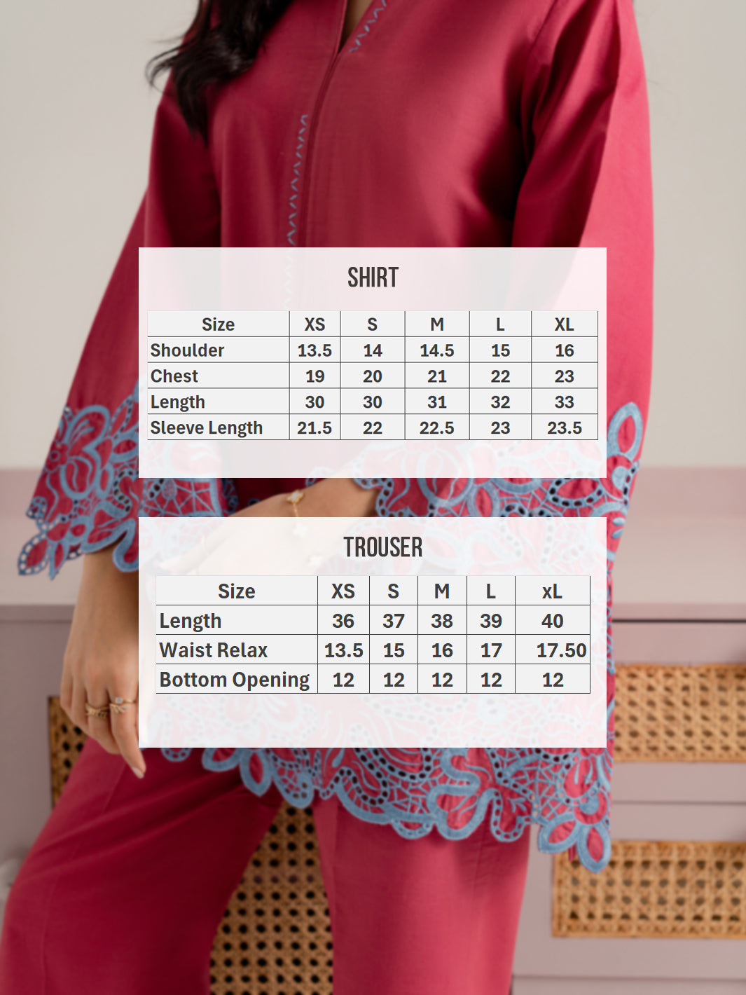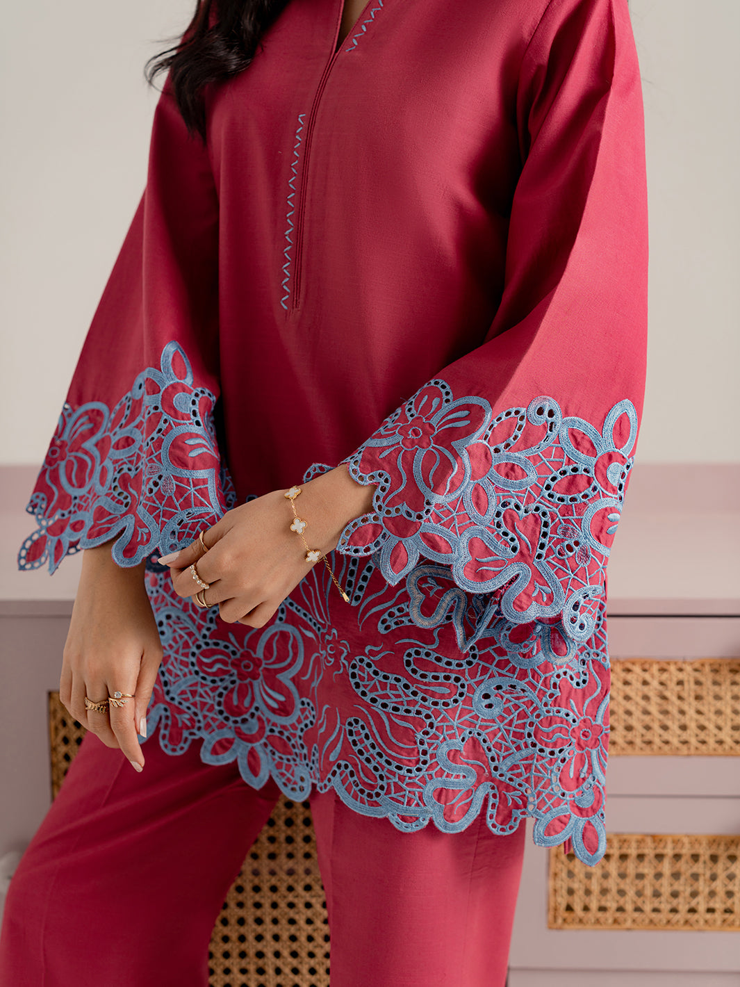 Design: A striking deep coral pink base enriched with contrasting sky-blue floral laser-cut embroidery on the hem and sleeves.
