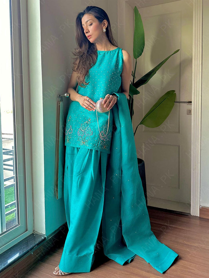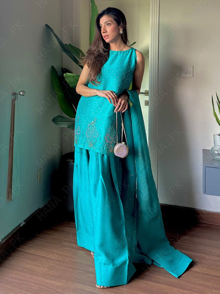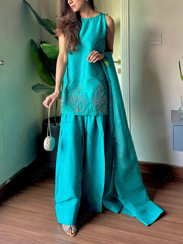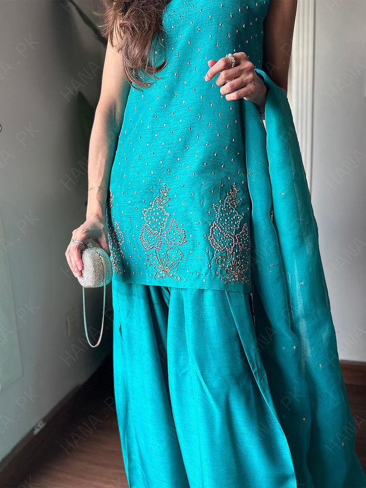 A Chic Rawsilk dress with Hand Embellishments to die for around the Ghera and all over the front.