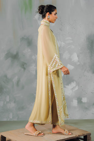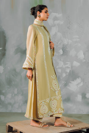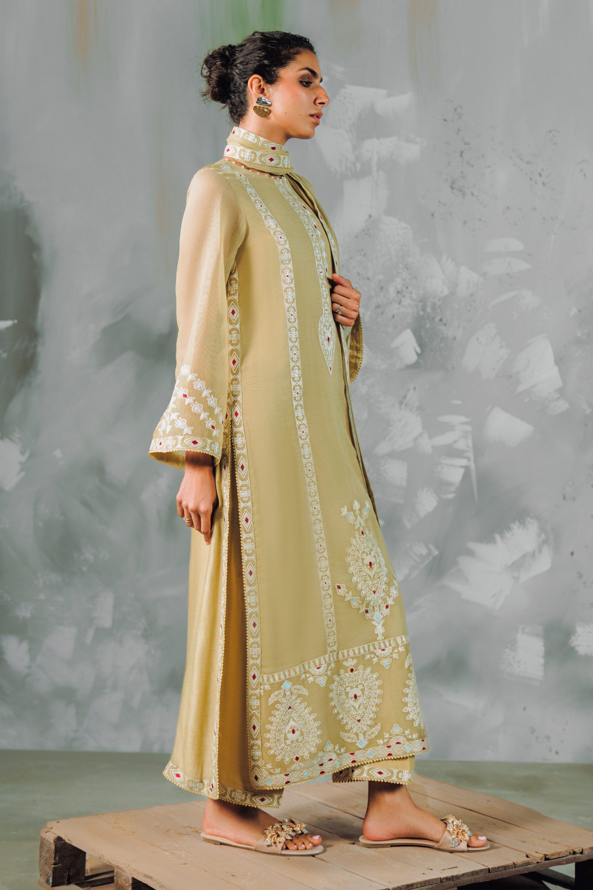 The shirt is crafted from delicate Tusser Khaddi Net, offering a lightweight, ethereal drape. It comes with a soft Cotton Silk inner to ensure a comfortable, breathable fit against the skin without compromising the net’s sheer elegance. The look is grounded by tonal Raw Silk trousers, providing a structured and polished finish to the flowing silhouette.