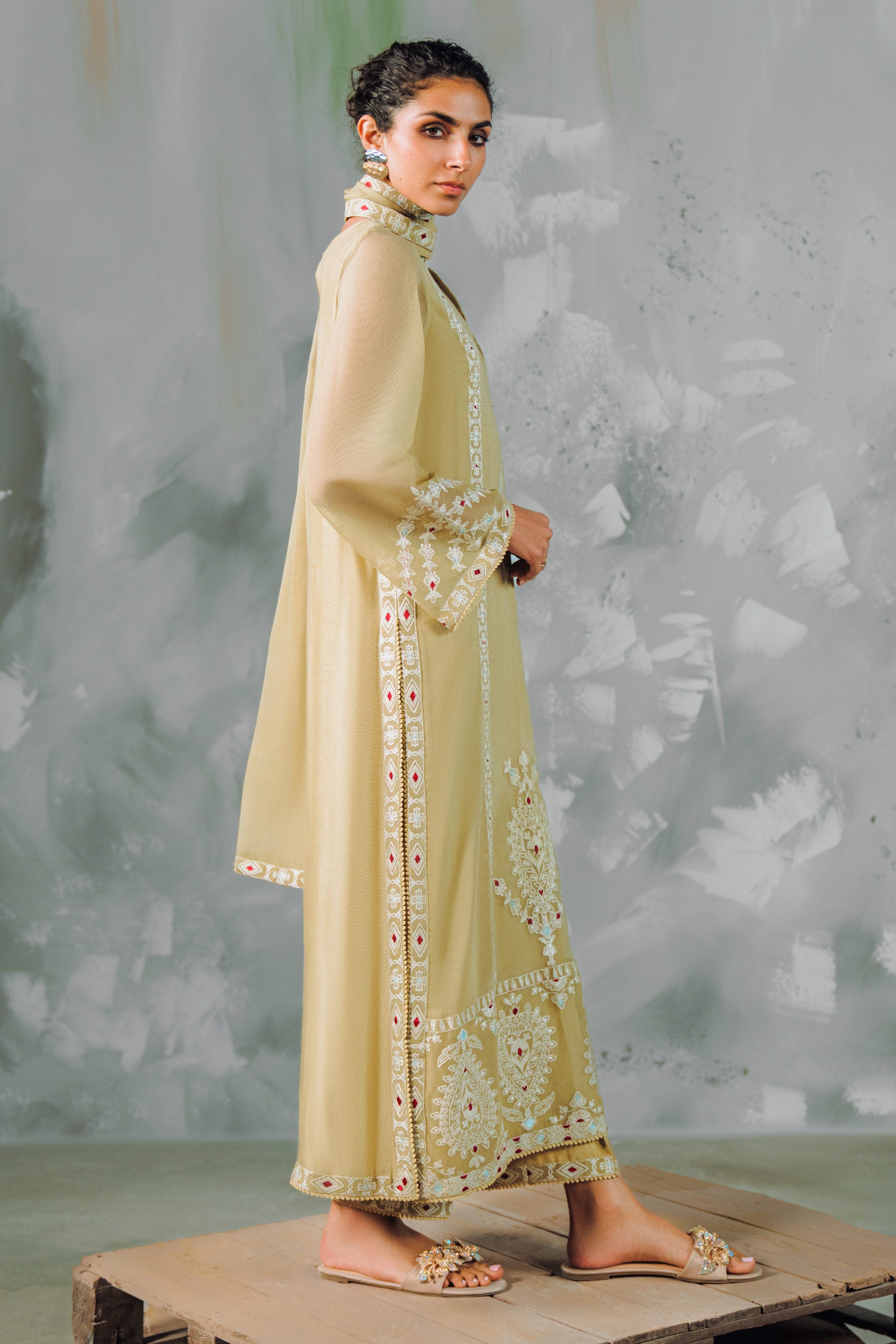 The matching Tusser Khaddi Net dupatta is generously adorned with Aari-work borders, making it the perfect statement piece for high-profile Eid gatherings.