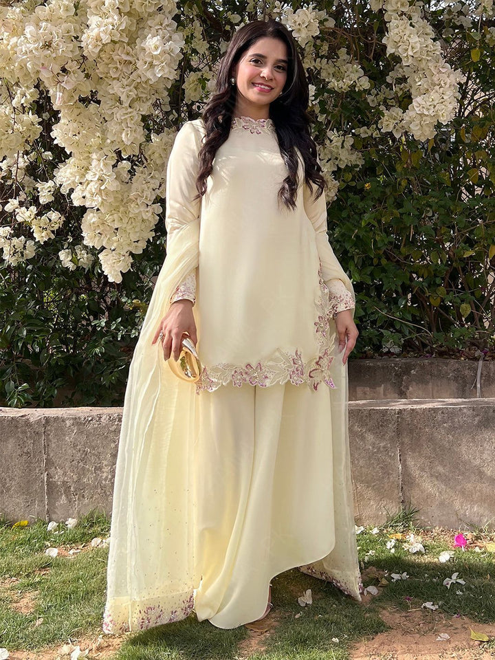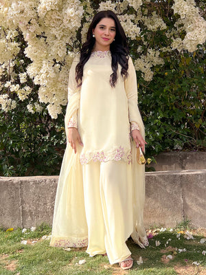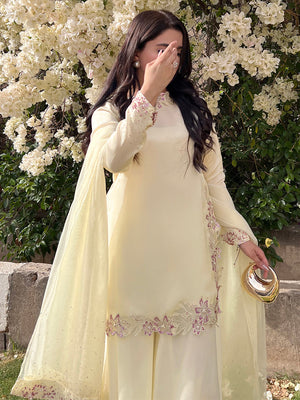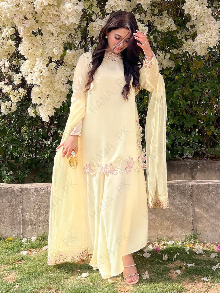 Organza Satin Dress featuring a flowy silhouette with intricate Adda work, aari work, hand cutwork and stone details on the sleeves, hem, and dupatta border.